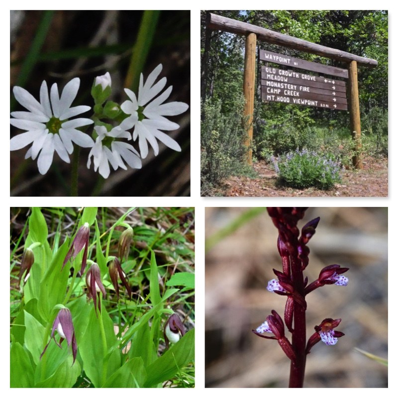Today we made our annual trip to Brooks Memorial State Park to hopefully see blooming Mountain Lady Slippers. We were able to find some blooming ones, but many are still in the embryo stage. Balsamroot was fading and lupine was just beginning. Its fragrance filled the air in the light breeze which followed us on much of the trail. The trail begins from the TH across HWY 97 from the CG where we are camping for 3 nights. When we reach the trail sign which is in the collage in the 4th picture, we headed east (left) on the Brooks Nature Trail which is no longer signed to do a lolly-pop loop to the start of the Lady Slipper Trail which is no longer signed. This trail returns to the Brooks Nature Trail and back to the TH parking area. One spotted coral root, a few pea flowers, yellow desert parsley,a few prairie stars and Larkspur were also seen.