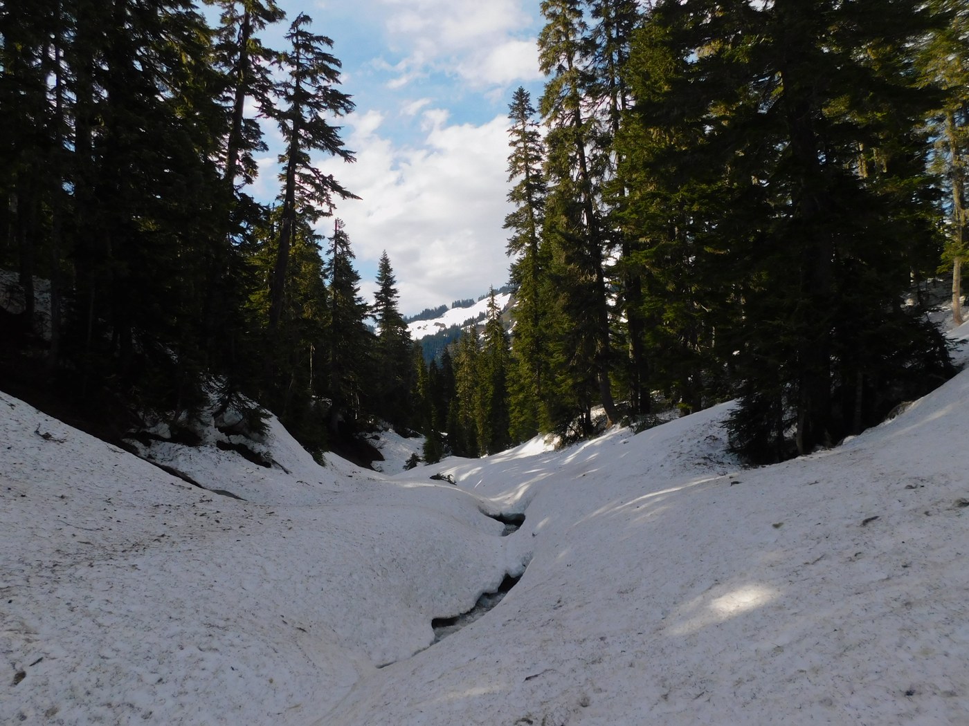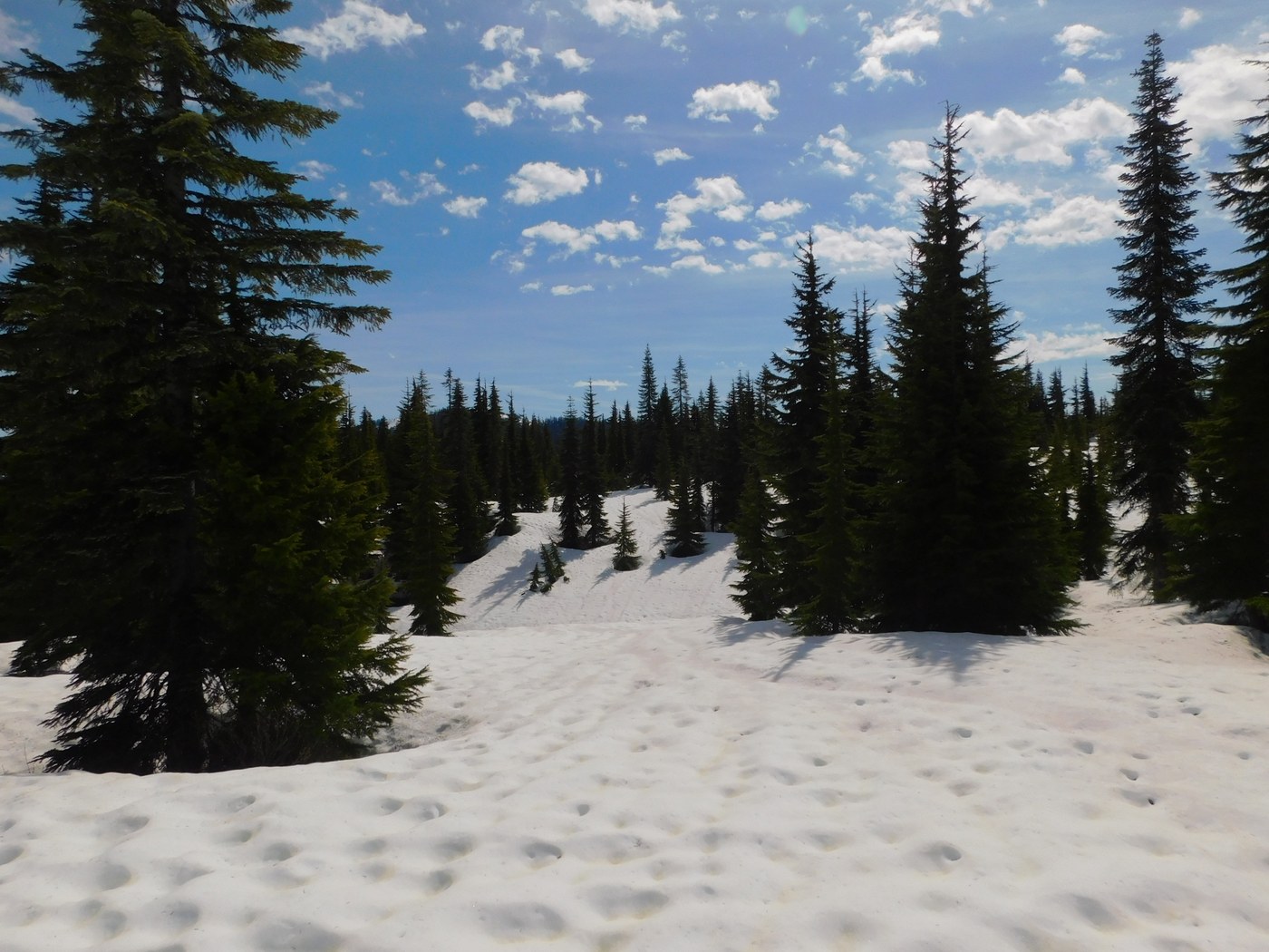 -The PCT is, along with most of this hike, still under considerable snow. Multiple times I sat down and slid as best as I could, dodging trees and other obstacles.