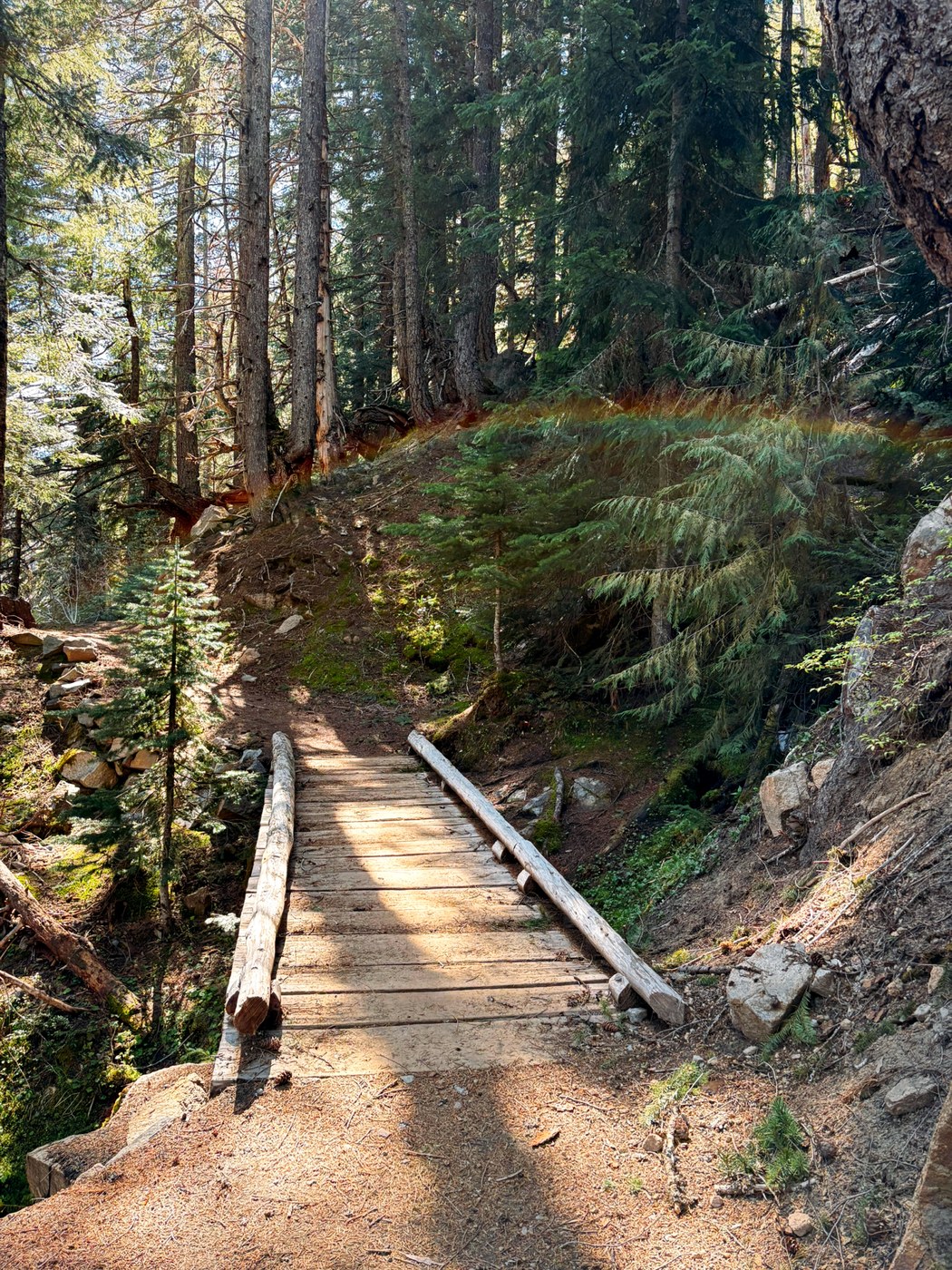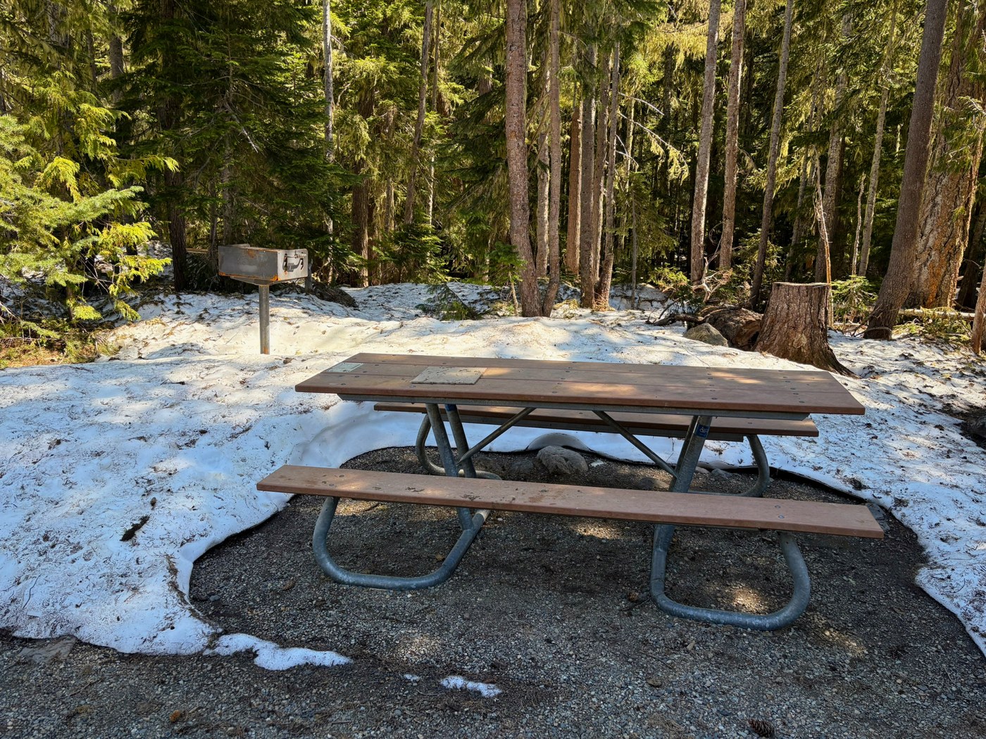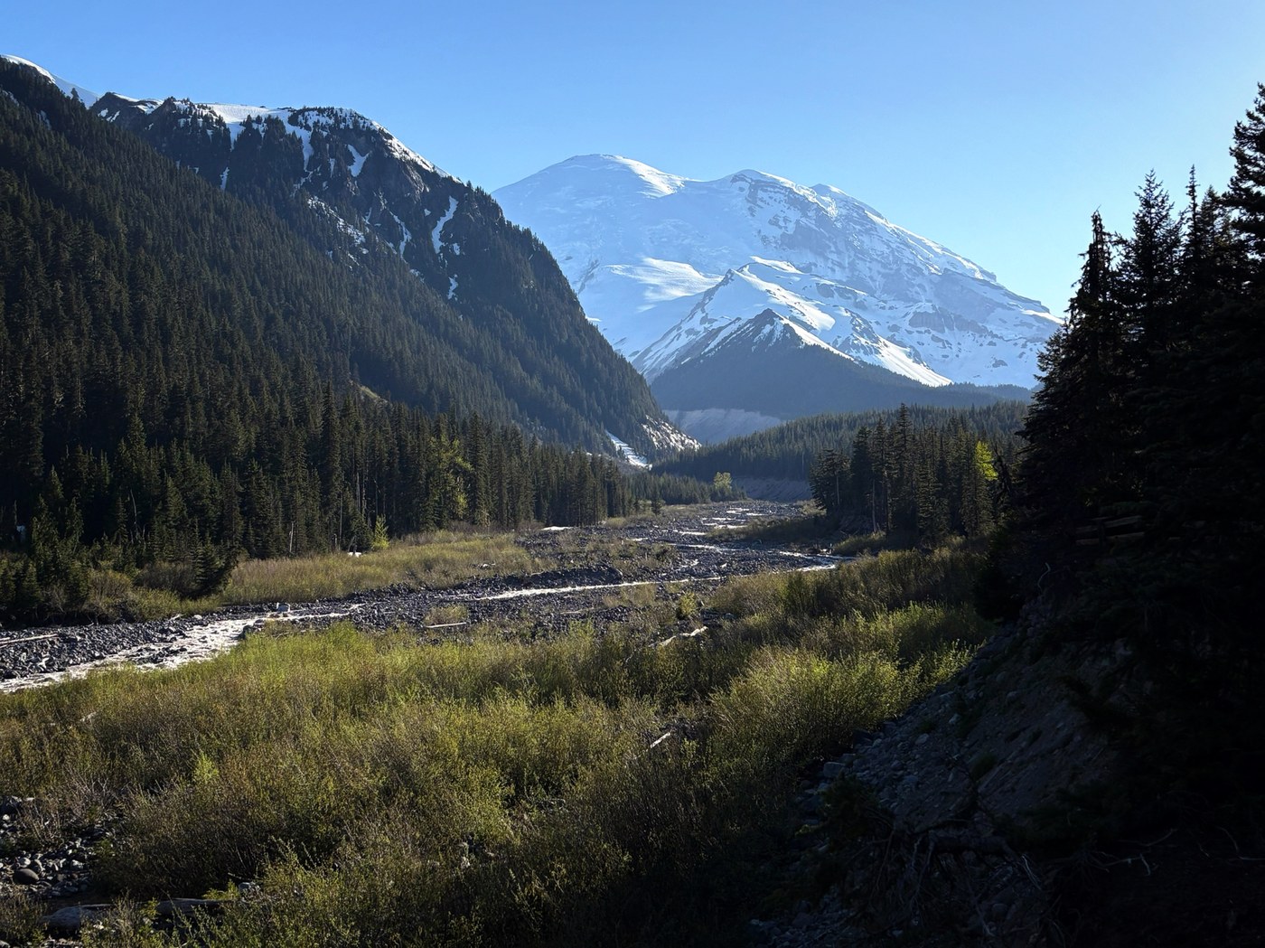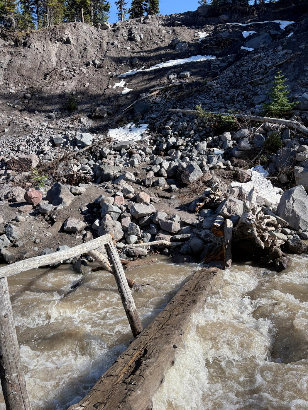 Attempted to get to the Emmons Glacier Overlook but the bridge to cross to the moraine is currently out (see image). Glacier Basin is still snow covered but hikeable ~ would recommend gaiters and microspikes as it is slushy and posthole-y past the overlook spur. Drier and hotter than usual so definitely bring water and sun protection as well ~ there were a lot of mosquitoes and flies, but also several species of butterflies in places. No ticks yet.