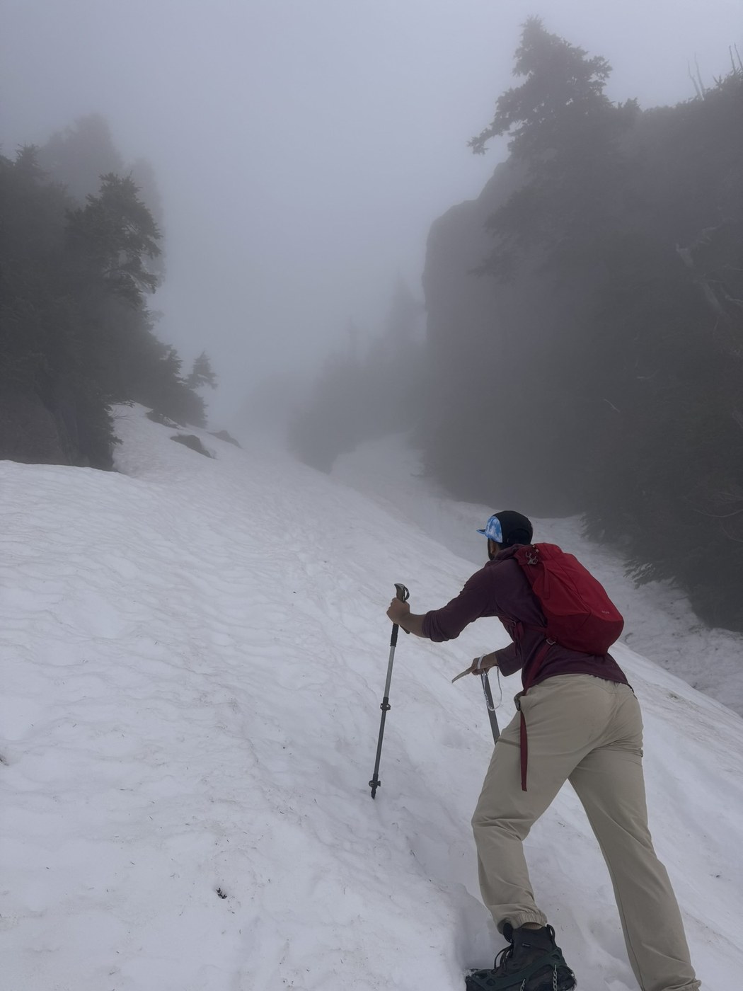 Started from the upper trailhead around 8:30AM on Sunday June 1st. There were only 3 other cars in the lot. We got unlucky with some weather - it was sunny when we parked but right when we started, we got hit with thick fog and clouds. This unfortunately kept the snow hard and somewhat icy. I was wearing microspikes and while they may have been sufficient in warmer conditions, they did not cut it now. I actually slipped and fell about 30 feet down the slope but managed to self-arrest with my ice axe. The axe was the most important tool I had, without which I would not have been able to summit that day. My buddy had crampons and he fared much better. The sun kind of came out as we exited the chute, which helped soften the snow and made the last few hundred feet of vert more manageable. We summited around 11am, hung out for an hour at the summit in swirling clouds, and then glissaded most of the chute down. By this point the snow had softened up, so glissading wasn’t too bad, but it was still sketchy in some places, as there were visible holes in the snow, rocks protruding, etc. There are also a couple rocky breaks in the snowpack that you have to scramble over. I would expect some of these areas to get sketchier as the snow melts more. Still had a fun time but had a couple terrifying moments as well.
