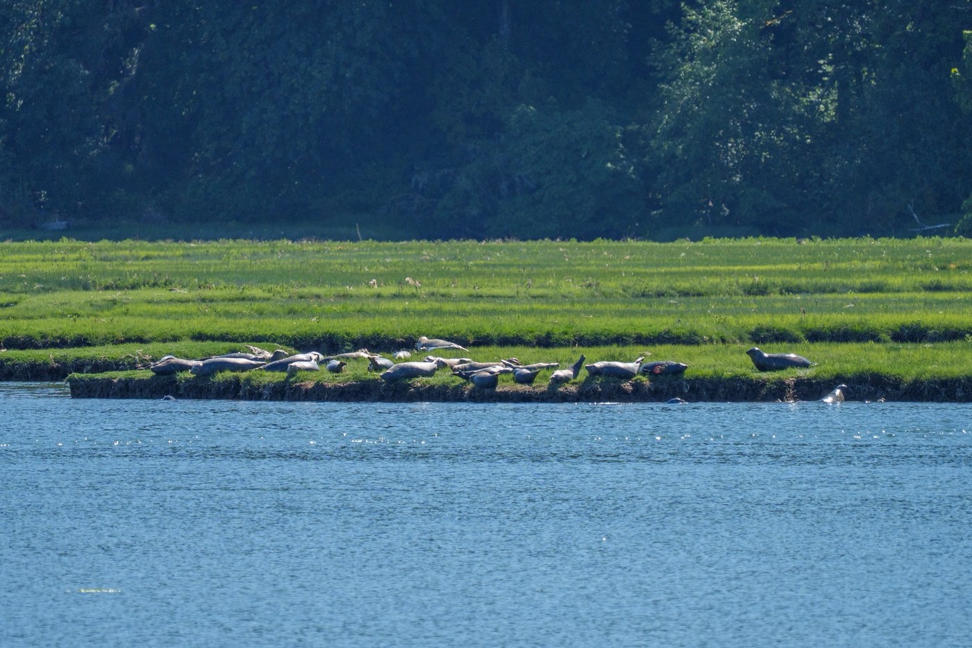 Beautiful day and saw lots of wildlife. Frogs, harbor seals (a group of at least 30 of them!), birds galore (terns diving for fish, squabbling seagulls, bald eagles, herons, warblers, red wing black birds, swifts, variety of ducks, cormorants, hummingbird, and other smaller brown birds). Even spotted a turtle, a deer, and some tiny crabs. It was amazing!! Arrived as the tide was coming in.