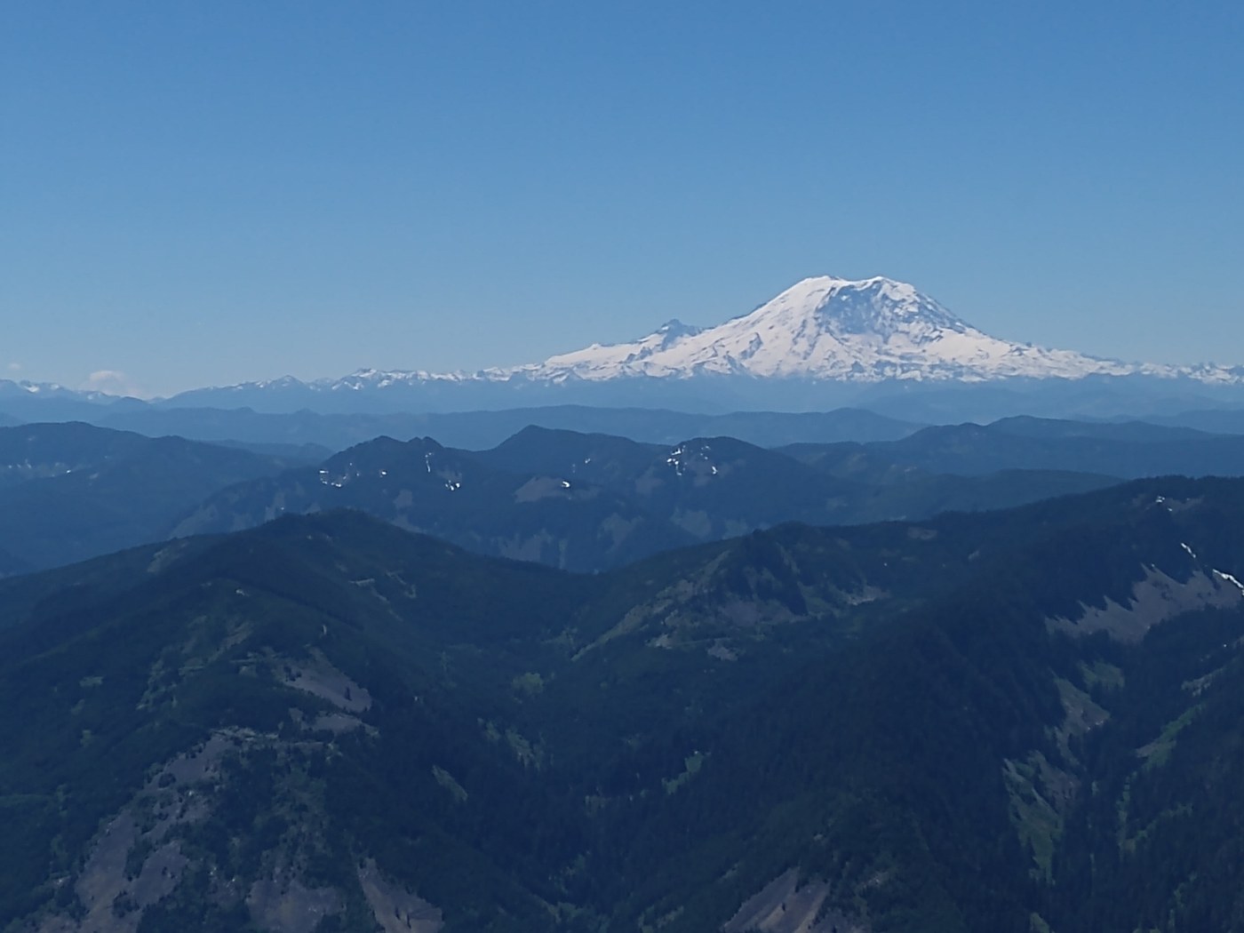 On June 9th, I hiked past Rainbow Lake, Sir Richard Pond, Mason Lake and up Mt. Defiance. The wildflowers along the exposed section of the trail on Mt. Defiance are switching from yellow glacier lilies to red columbine and lupin. The views from the top of Defiance are spectacular, especially rewarding after that final 0.2 mile buns-of-steel workout. Of course, Mt. Rainier is right smack in your face, but you can also see Mt. Adams in the distance next to Rainier and Mt. Baker and Glacier Mt. to the north and Mt. Stuart to the east very clearly. Two groups of two hikers joined me on the summit soon after I arrived. After Defiance, I ventured over to Mason Lake and the trail up to the 4,300 ft pass on the Ira Spring trail to check if there is any snow remaining. There is no snow at Mason Lake nor on the trail. But Mason Lake was also covered in tree pollen. And you could see the pollen floating in the air all around you. I’m certainly glad I’m not allergic to it.