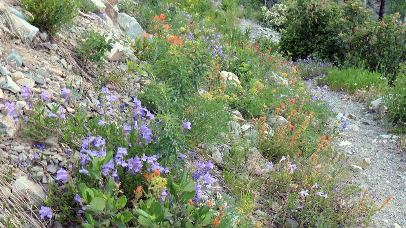 The flowers are blooming in the first 3 miles, with the fragrance of snowbrush dominating the still morning air in the first mile. It was nice to make the turn into the North Creek valley in the shade of the ridge across the creek. It stayed that way until I reached the forested section at 2.3 miles, when the sun crested the ridge. Along the way were many flowers and only two logs to get around/over.