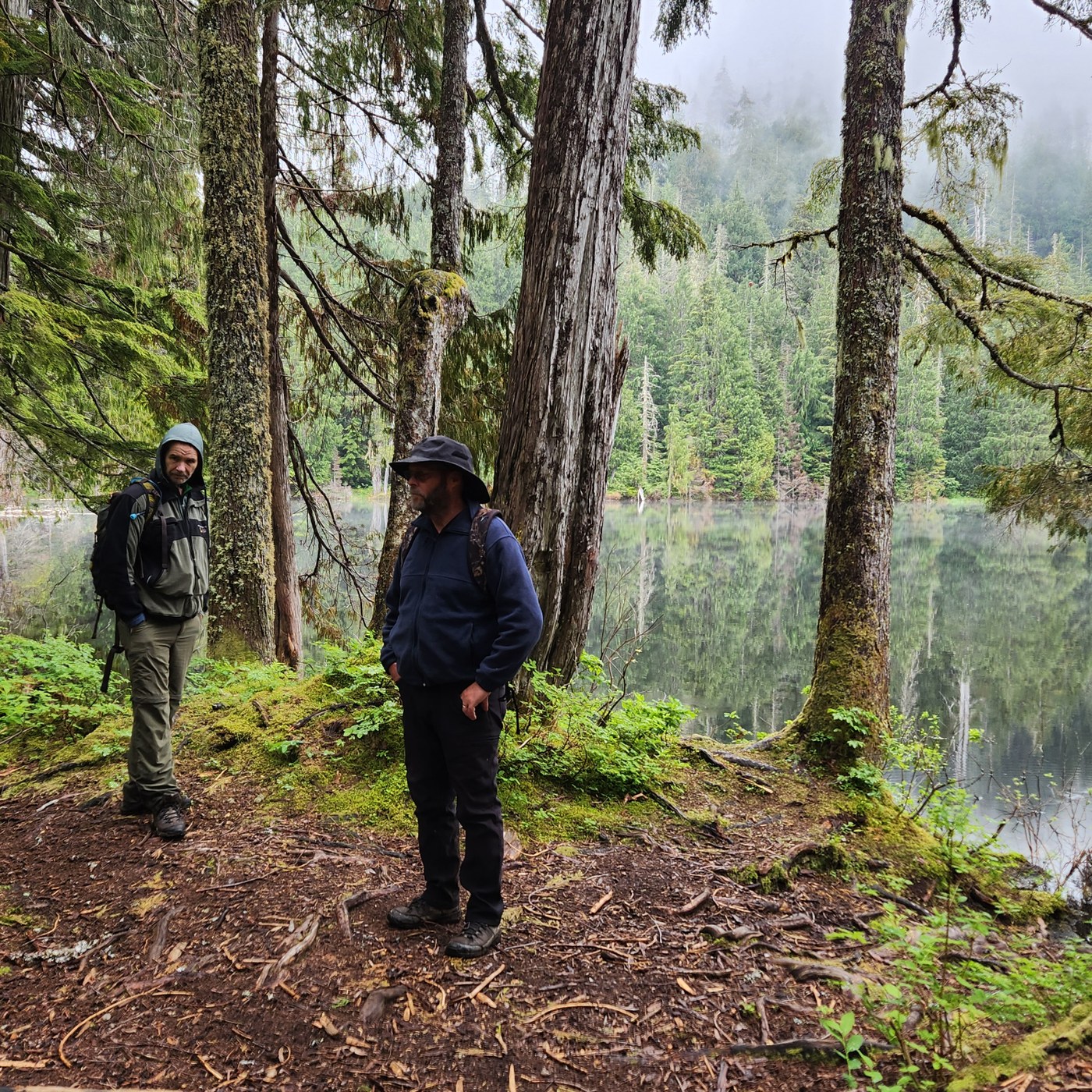 Pinnacle Lake has a challenging road. My RAM 1500 bottomed runningboards a few times due to giant potholes and rocks sticking up from the roadbed. We also had branches rubbing on both sides and the top with no place to turn around for a couple of miles. Slow going. Having said that there was a 2 wd BMW parked at the trailhead. We were amazed. It looks like quite a few parked beside the road and walked in. There were small patches of snow once we got up high but none on the trail. The trail was rooty, muddy, and a bit brushy. The weather was cool and misty. It looked beautiful in the fog, but no views today. We did stop by Bear Lake on the way out and there is a back country toilet there. It is a nice little lake.