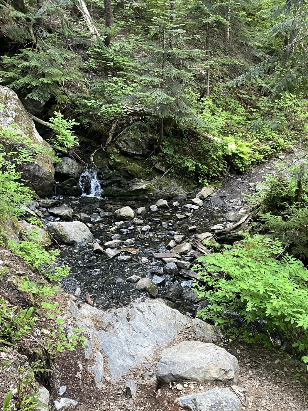 Trail is in good condition with only small patches of mud! Only thing to note is a large downed log at ~1.5 miles and a small stream crossing shortly thereafter. Log shouldn’t be too hard for most people unless they’re recovering from knee surgery like me (yes, sea otters have knees!). There were good stepping stones across the stream so my flippers didn’t get wet, but the flow could get bigger if there’s more snow melt.