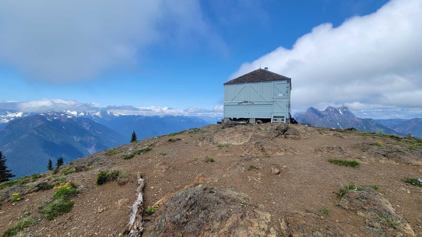 Water at 3800 ft (on gaia). 10 second s to fill one liter, via a little one foot waterfall. Flowers blooming, esp up high. Lookout still shuttered. Nice separate cooking area at Desolation Camp.