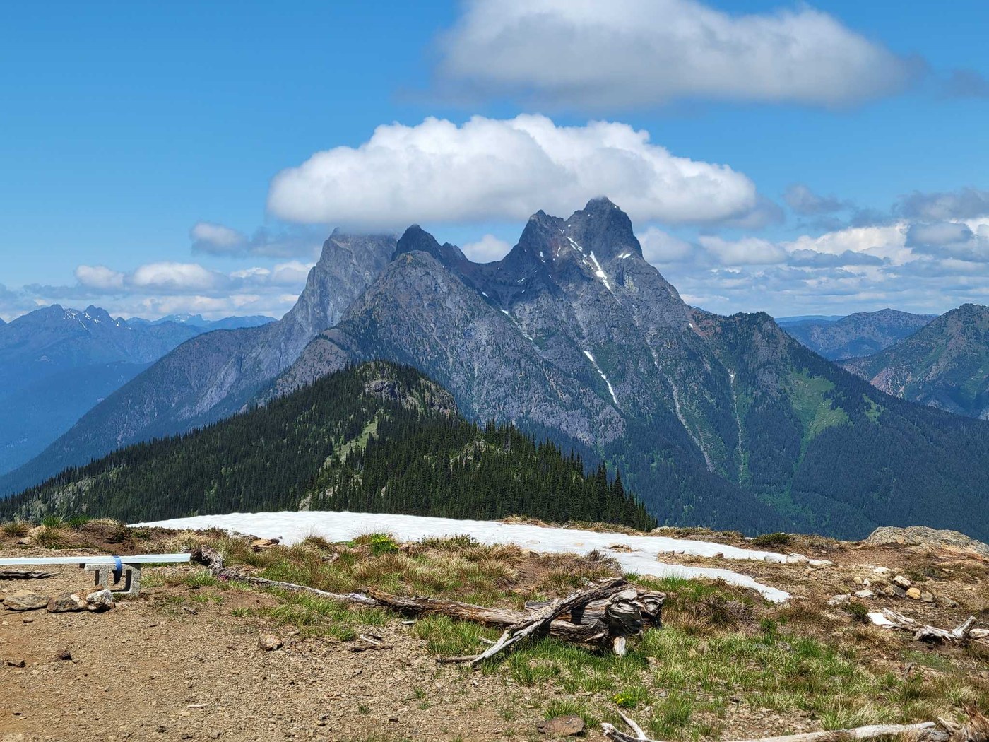 Patch of snow on top past lookout that if desperate could melt for water. Otherwise basically none. Trail good. Blowdowns cleared. Evidence of recent treadwork in several places. Not rocky until towards top. Nice forest path.