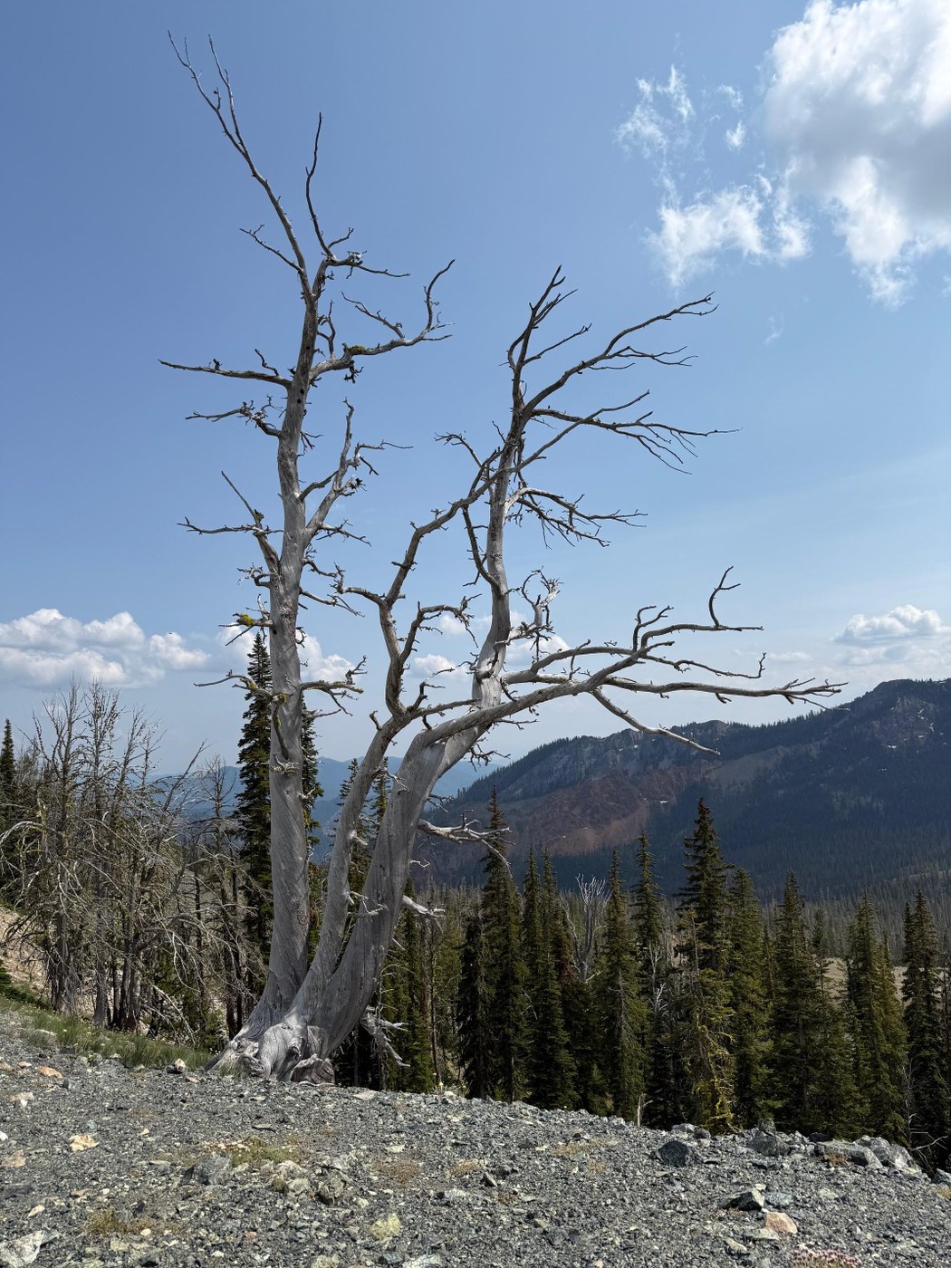 It was warm when we started. I had two Teanaway hikes with flowers and peaks on my list to choose from, and I decided to do this longer one since the weather forecast was cooler than this time next week. And in case I could only do one of them this year, I figured I wasn’t getting any younger. After doing this hike, I highly recommend on a warm day to take advantage of either the early morning or early evening for cooler temperatures. I actually enjoyed ending my hike in the early evening as we got to enjoy cooler temps when we were more fatigued. And this was a hike of perseverance to get to the peak. Between the pass and the peak, there were a couple of spots that had that nasty combination of being steep and having loose soil. These are areas that are harder to go down than up when you really don’t want to fall or slide down any bit of the hillside. Only one spot that had some snow completely over the trail, but it wasn’t hard to go around. Although not a clear day for best views, it was still spectacular, especially for someone who’s not used to seeing these peaks. The flowers were also spectacular. The trip reports from AlpsDayTripper will give you a much better idea of what all there is to see out there in that department. I am including a collage of some of my favorites. Highlights for me was seeing yellow columbine and a pussypaws plant, which I find cool now that I know they can thermoregulate by raising and lowering their flowers. Butterflies were literally everywhere. They were in the parking lot, on every pile of horse dung, at every water crossing, and would fly into me. And like the flowers, they were gorgeous and very distracting. Also saw a small brown snake near water and a Clark’s Nutcracker flying through a section of the trail.