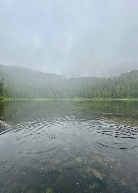 Our hike up was rather uneventful, the tree cover provided a a good amount of protection from the rain so we didn’t get too wet. However, after taking the cutoff trail that connects to the Pratt Lake Trail and climbing up and around Olallie Lake the trees broke up a bit and we opted to put on our rain jackets as we started to get more wet. The Pratt Lake Trail gets a little muddy in this section but for the most part you can hop around the puddles. After we took the split to drop into Pratt Lake Basin we realized the entire basin was in a cloud. We were pretty chilly at this point and decided to turn around before dropping all the way down to the lake so that we could get back to the car before conditions became too miserable.