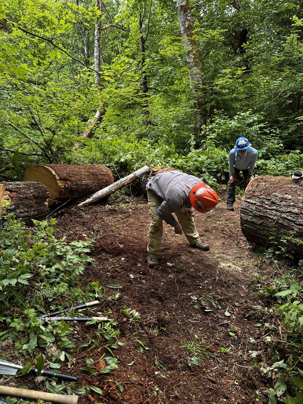 Our work party goal was to remove 2 large trees that had fallen across the trail above 5-Mile camp. We cleared those trees and a few smaller ones encroaching on the trail. We did disturb a bees nest and suffered the wrath of the owners. That tree was left by the side of the trail. We brushed our way back to the trailhead and that is where I picked up a hitchhiker - TICK! So be sure to do a careful tick check once you are back at your vehicle. Mine was at my waist probably because I was taking off my pack, placing it off trail while brushing a section, then putting it back on without looking for hitchhikers. The wild huckleberries were just starting to ripen and they were tasty!