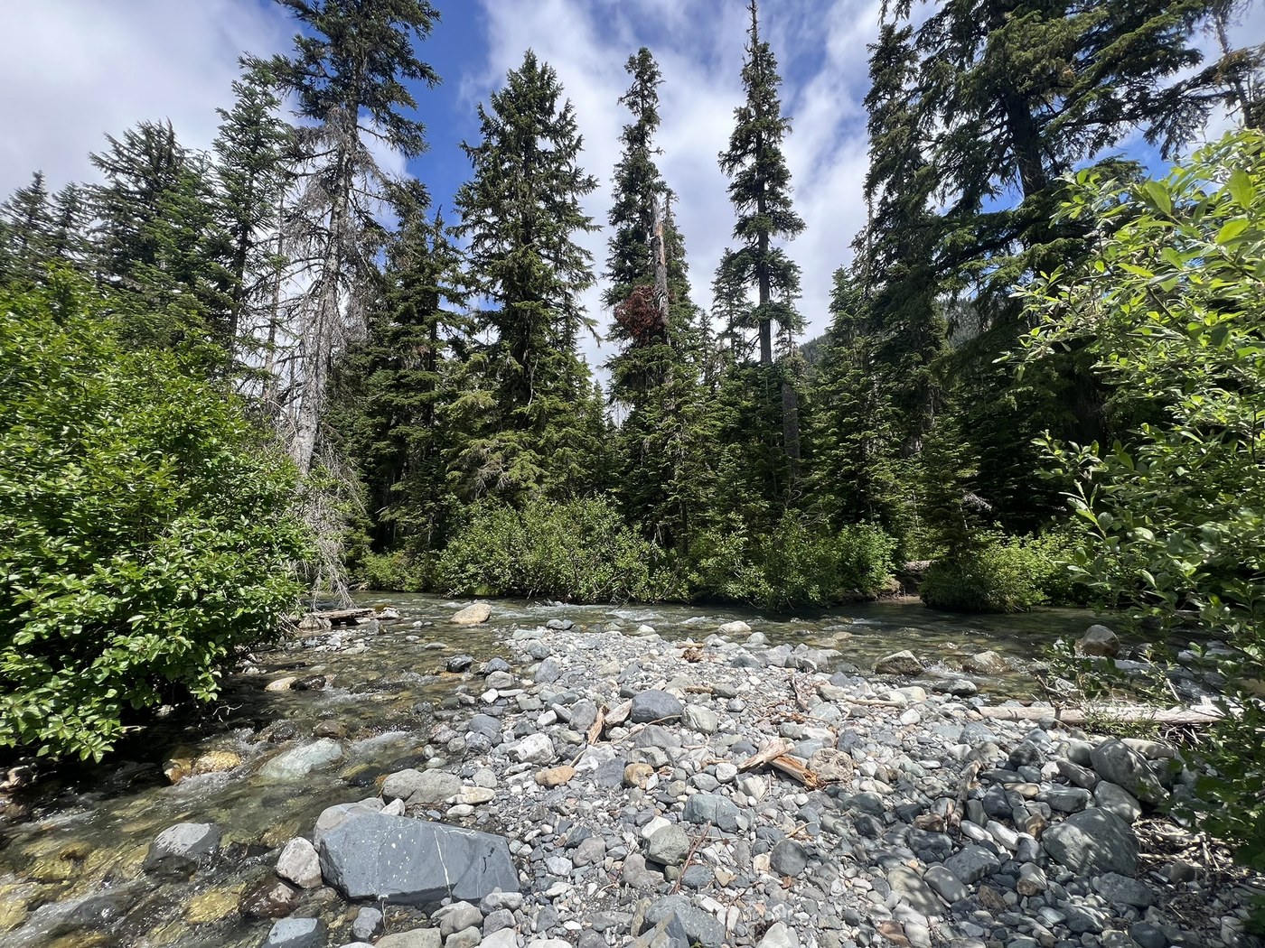 What was intended as a one nighter because a long day hike when we reached Spectacle and realized we had forgotten our poles. Oh well! The trail to Pete Lake is wide and relatively flat - we clocked just over 4 miles. Lots of places to enjoy lunch and a swim at Pete before pushing on. About a mile after Pete is the Lemah Creek crossing. While others have commented on its high flow, we found it posed no problem to ford, other than the cold temperature! Having water shoes (I wore crocs) and poles were helpful. Water came up to my knees (5’6) but it was not too forceful. After the creek crossing, there are several downed trees to cross but nothing too cumbersome. The meadows are bursting right now, making the trail feel a tad overgrown, but I imagine that will die down soon. Some mud/water on trail on the final approach / switchbacks to the Spectacle Lake connector trail. We clicked an additional 6.5 miles to Spectacle, which is cold but snow free. All in all, a lovely early season hike!