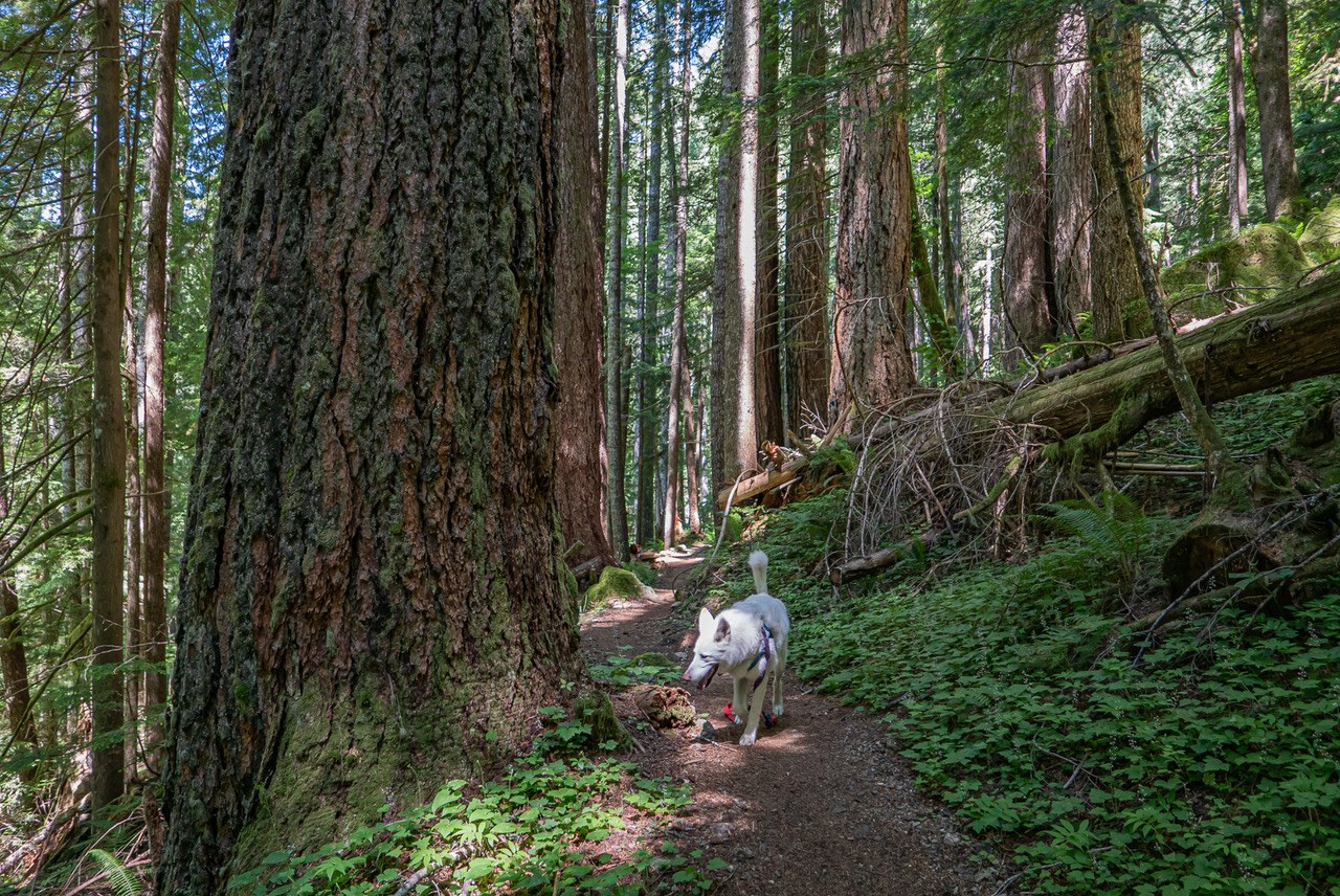 The forested connector trail was nice and shady, after the official sign at the old trailhead ("Perry Creek Falls 2, Mr Forgotten Meadows 4") the trail begins to ascend more sharply and spends a fair amount of that in open slopes with nice views across (waterfalls) and down (mountains) valley. The last time I did this trail I was 28 years younger, on a date with my new boyfriend (now husband) and I totally don't remember it climbing that much even though that day we went all the way to Mt. Forgotten Meadows! Today the heat, in the 80s with no breeze, was a bit draining, and the footing is rocky, so it felt slow. Lots of columbine, some tiger lily, and other flowers. Three good creeks for the dog but they aren't until a couple miles in so we were glad to have extra water and a bowl to give her on the way since it was so warm. The final creek crossing had a little rock hopping but the rocks aren't slippery and it was easy to keep feet dry. At the falls there's a nice shady spot on trail with a good sitting log and rock. Had lunch there and turned around. Round trip took us about 3.5 hours including stops. We probably saw 20 other hikers including several backpackers heading from or to Mt. Forgotten and meadows, and other day hikers.
