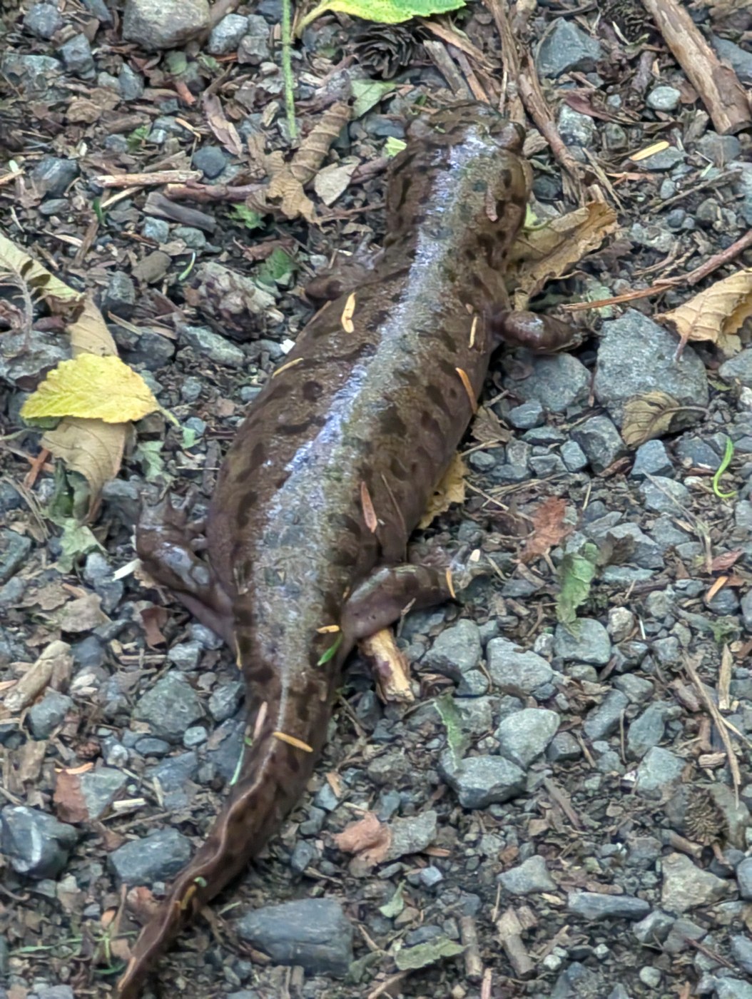 - There was a big Salamander on the lower portion of the trail near the reflection ponds. I reported it to WDFW after trying to id it as it appears to be an "At risk" species. I think it was a Cascade Torrent Salamander? (See picture)