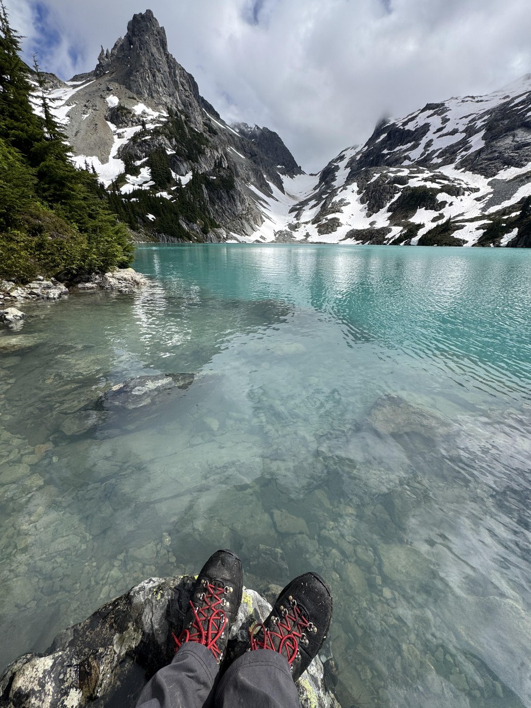 The next day we woke up to the same mist and rain, but the clouds broke around 1. It was partly cloudy for the rest of the day, getting clearer as the afternoon and evening wore on. At 2, we made the trek up to Jade. Sections of this climb are quite arduous, and we were glad for our spikes and poles. There’s dangerous snow over boulder fields for long stretches, but if you’re good on boulders you can avoid the snow entirely. Rock slides are a risk.