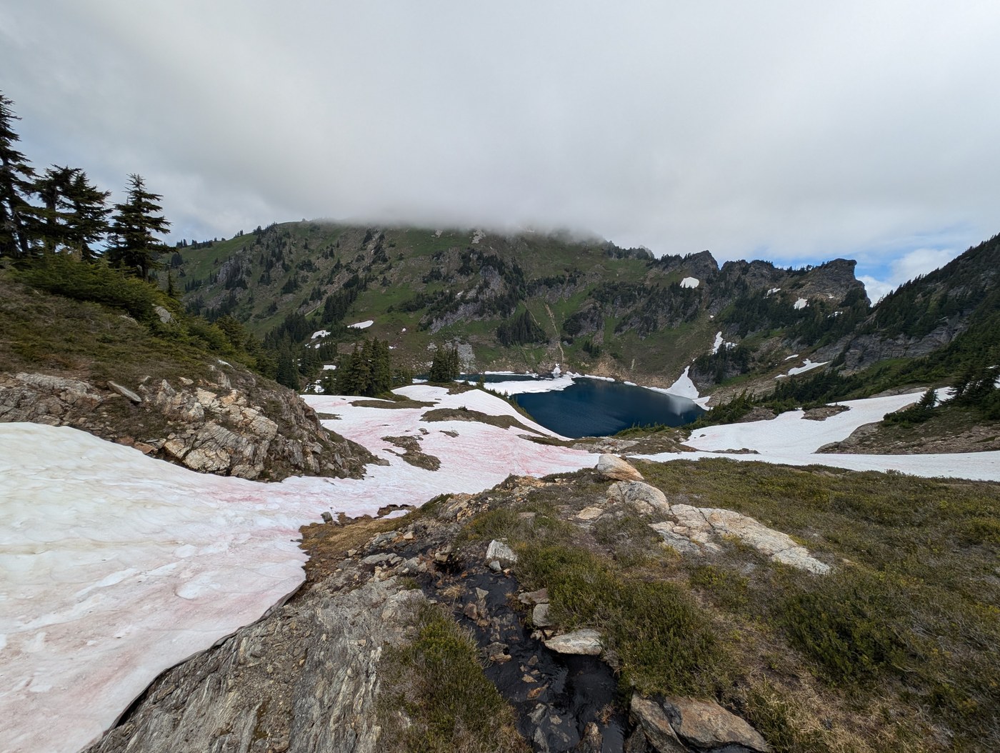Day 1: I camped about a mile from the trailhead Thurs night and started my hike in earnest on Friday, July 4. Crossing the North Fork Sauk River was easy as there is a very large log fallen across the tree, and it's been cut/flattened on top to make it easier to walk across. It's high enough above the water to not be too slick. After that the trail ascends relentlessly up towards Pilot Ridge. On this ascent there were two spots where there were a couple blowdowns that obscured the trail enough that having a .gpx track downloaded was helpful, but generally the trail is in good shape, though steep. The trail crosses a raging stream at ~3800 ft that is probably the last reliable source before Blue Lake. Early in the season I found a couple streams after that, but nothing after reaching Pilot Ridge itself. The hike along the ridge is beautiful and you can look across the valley and see where the North Fork Sauk River Trail meets the PCT on the long, open slope between White and Red Passes (see photo). I ended my first day at Blue Lake, which is a gorgeous campsite but filled up early on the holiday weekend.