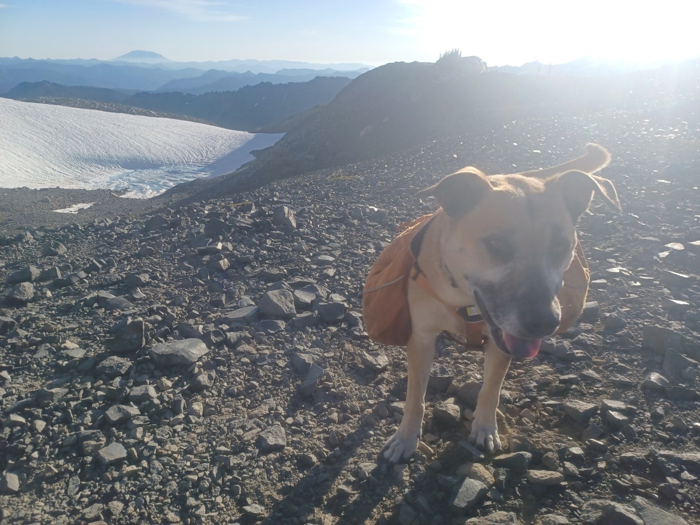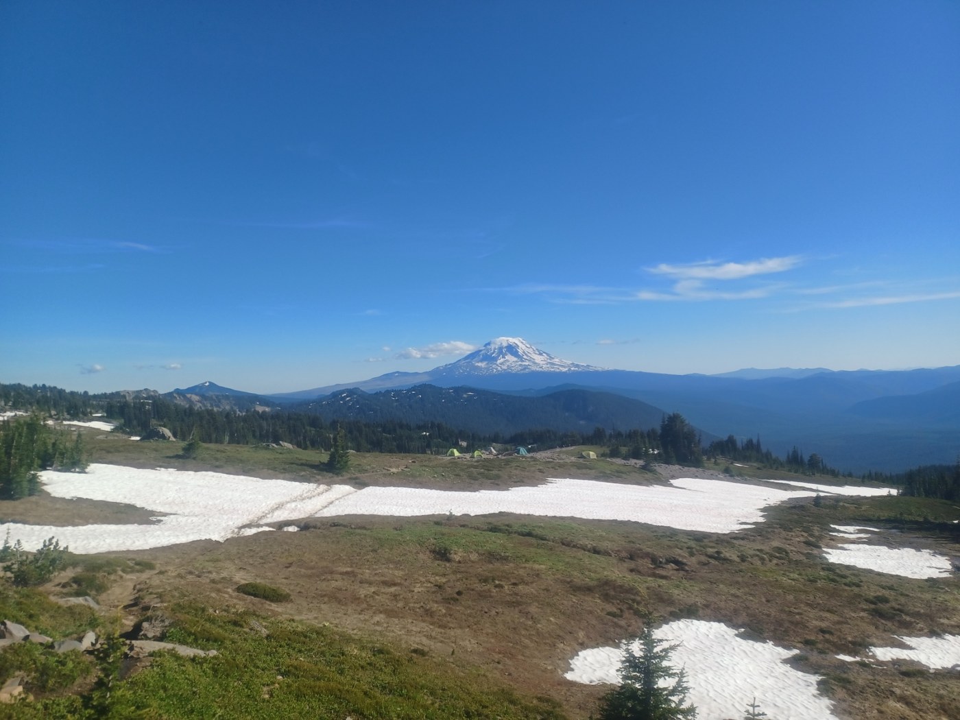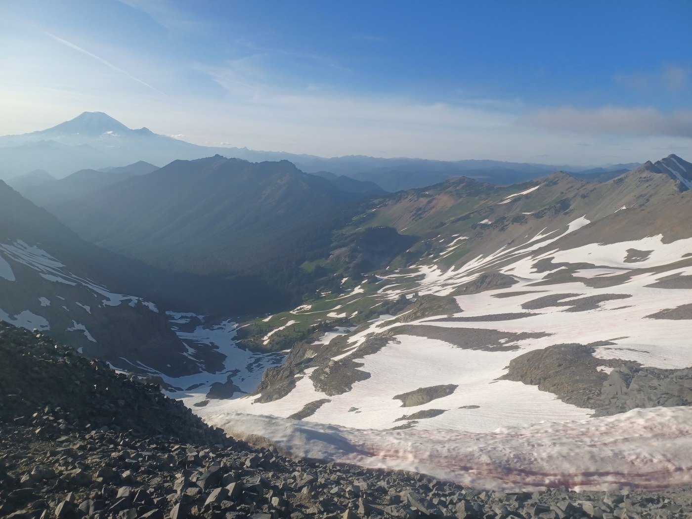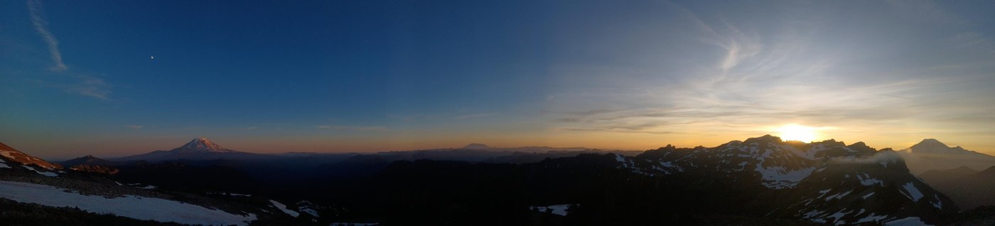 I arrived at the lake in the early afternoon, which is snow covered still. After lunch, I decided to hike up to the PCT to camp at higher elevation away from the mosquitoes that other hikers told me were pretty bad in the valley. I missed that there is a connector trail close to Goat Lake and ended up ascending from Alpine Camp. There are many campsites above Alpine Camp that have progressively more incredible views. Along the PCT there are several snowfields to cross, which were soft in the afternoon. A thriving population of marmots were alarm calling frequently along the PCT often perched on boulders near the trail. I stopped at a rock walled campsite just south of Packwood Glacier that had a 180 view of Klickitat (Adams), Loowit (St Helens) and Tahoma (Rainier). Tahoma only became visible pretty close to Packwood Glacier. I hiked the last ~five minutes with a lightened pack to the ridge above Packwood Glacier to get the full view to the north. The panorama photo is from the campsite. I wish I had saved my battery for the morning when the light was even better. Temps were in the 40s, maybe 30s overnight, and I was comfortable in my 20 degree sleeping bag without a tent. I did not notice any mosquitoes near the campsite.