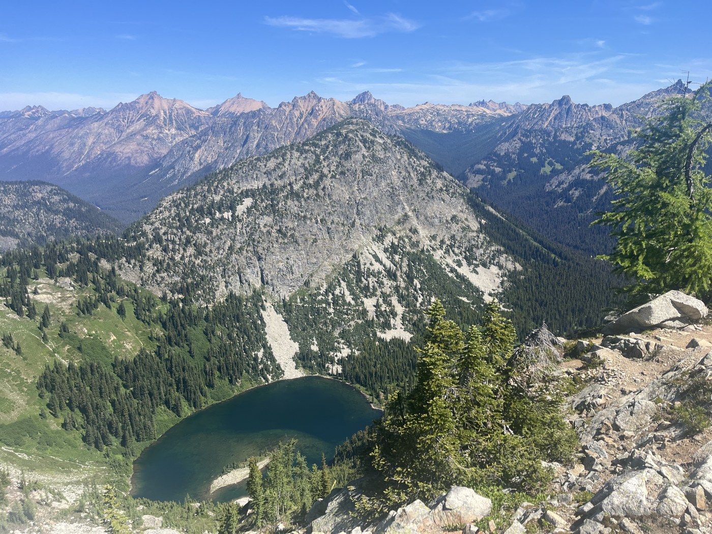 We arrived at the trailhead around 8:30 am and were able to grab one of the last parking spots - several hours later there were long lines of cars on Highway 20 as usual. For all the crowds that love this hike, we only occasionally encountered other hikers, in part because most of us do this hike in a counter-clockwise direction that spreads the crowds out. The trial is in excellent shape throughout, and the great repair work of the Methow Trails Collaborative and others is evident - thanks! This is a great time to enjoy this gem, as the entire trail is now show-free and the waterfalls flowing into Rainy Lake are on full display!