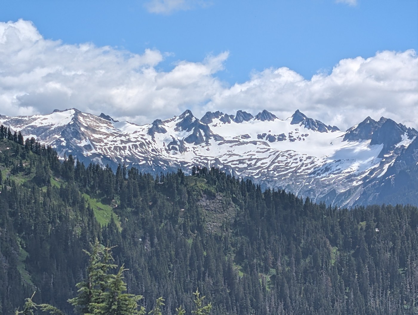 Moderate hike that earns you some 360 degree views, lots of familiar mountains but a unique angle. Watch out for the stinging nettle near the start. Terrain had a couple sections where poles were helpful and may have been mini scrambles without them. There was one very wet dozen feet, both other than that and a couple trickle stream it was pretty dry up to the ridge where some snow is hanging on. Bugs were pretty bad but nothing compared to the ones we experience backpacking last week. I may post a video of the road.