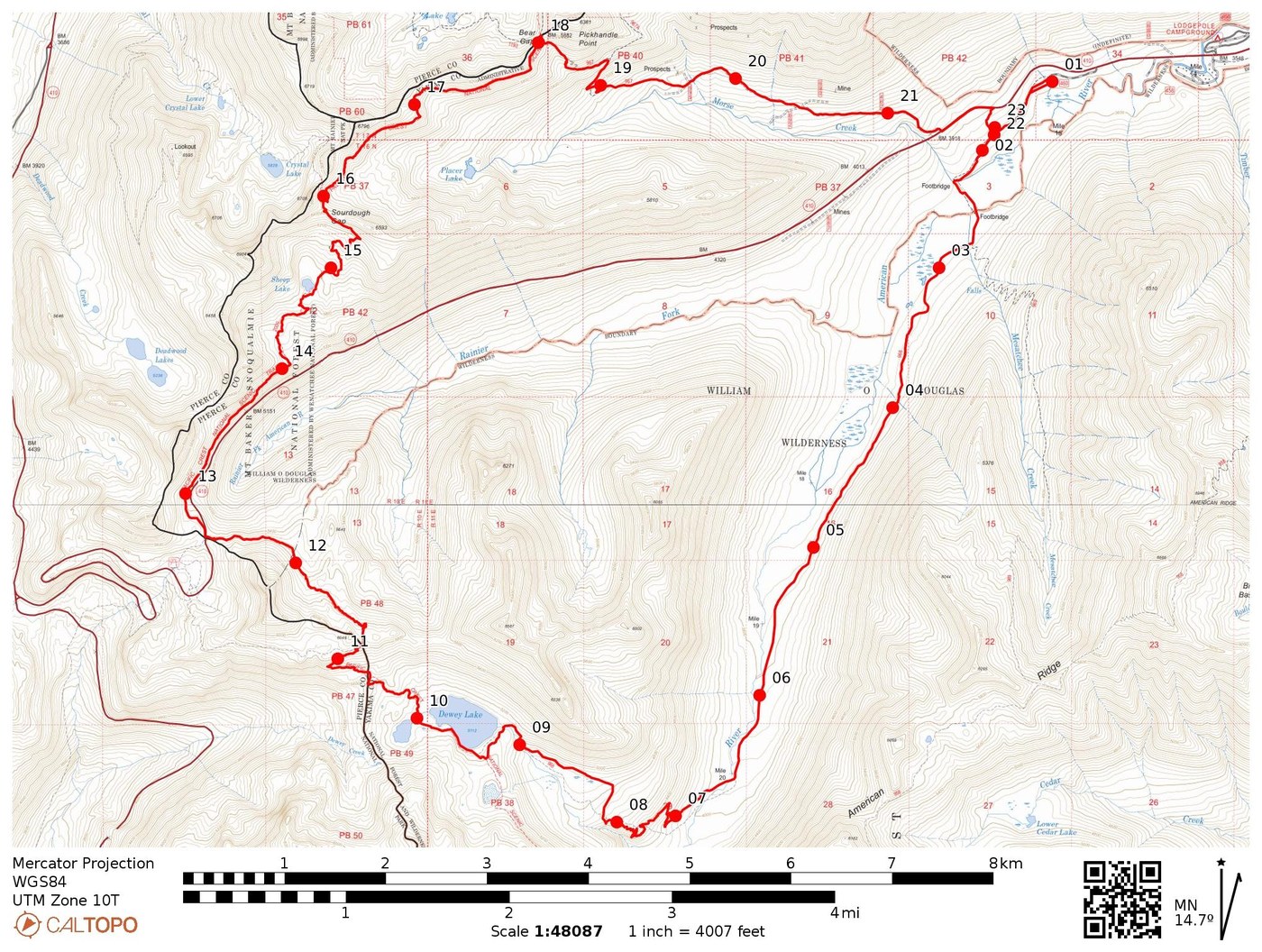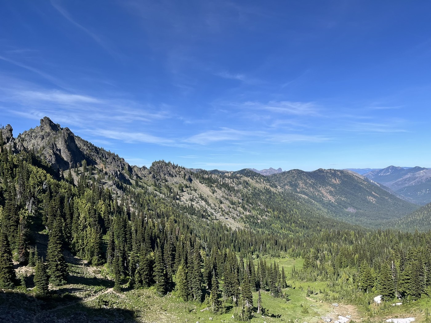 Starting at Mesatchee Creek Trailhead > we went up Dewey Lake Trail > joined the PCT to Chinook Pass > continued on the PCT across 410 > up-and-over Sourdough Gap > down Bear Gap Trailhead road > briefly scuttle across 410 and back to Mesatchee Creek.