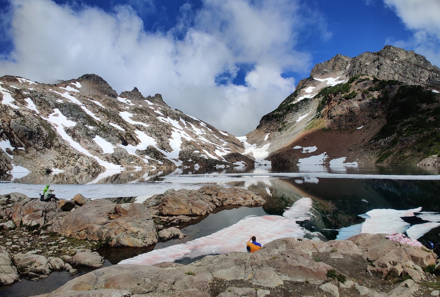 - Follow the edge of the lake to the south. Your goal is to reach the obvious ridgeline, coming around the back side and then following it to its terminus a few hundred yards below the beginning of the scramble route. Snow fields linger late into season, so expect some snow if climbing through mid-July. As you reach the end of the minor ridgeline, you will be presented with only one real option, southward and upward. The trail doesn’t really exist here, it’s a choose your own adventure kind of deal. But the talus is mostly large and stable, with intermittent loose crappy rock mixed in.