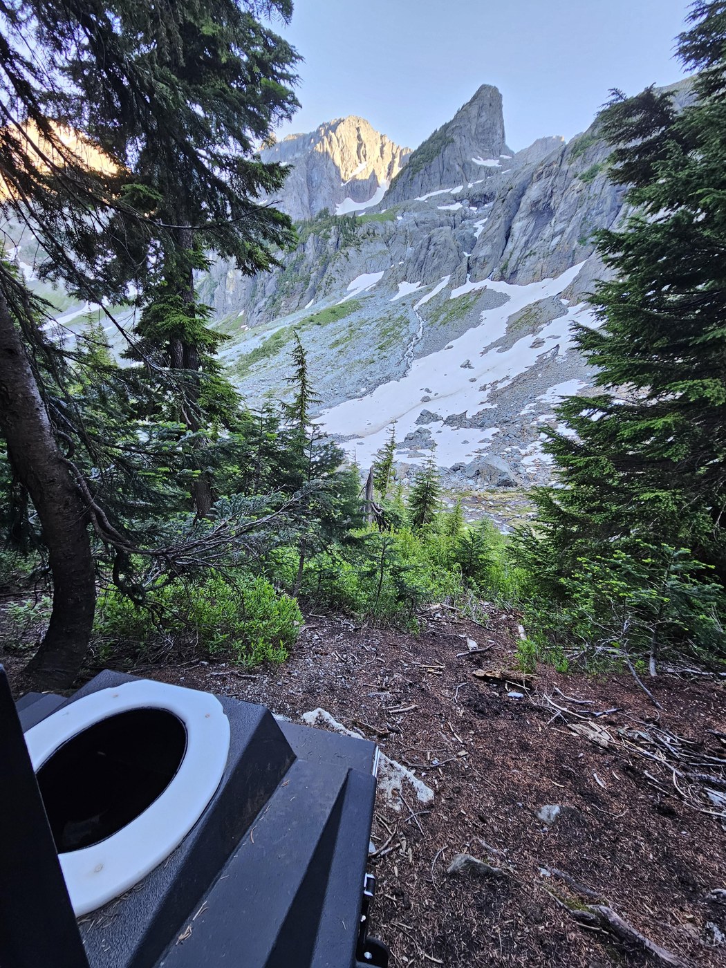 Pelton Basin group camp and shared cooking area is fully melted out, but a large snow pile remains in at least one of the other sites. However, campers appeared to be able to fit 2+ tents without camping on snow. We fit two 2p tents + five 1-p tents in the group site. The blowdown previously reported on the trail has been fully cleared. Toilet is in good shape but getting full. There are some large and unafraid deer that meander through camp day and night, so food can never be left unattended. Mosquitoes are getting bad, and seemed to be the worst in the afternoon and evening. Pelton Basin was unexpectedly beautiful - a worthwhile destination on it's own!