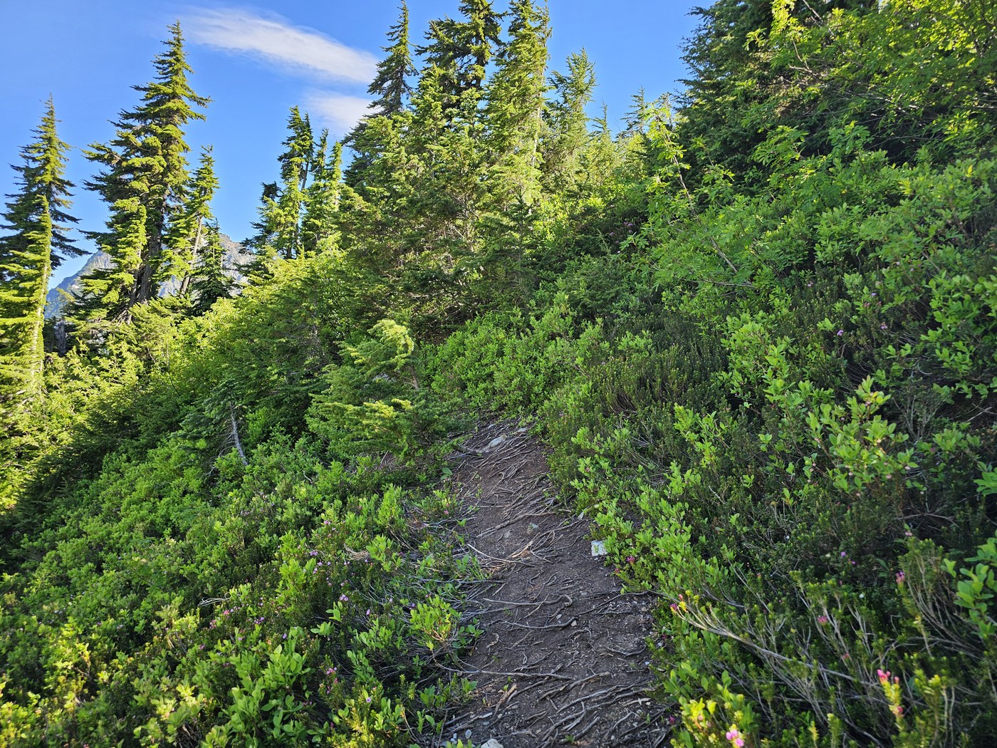 We continued down to Doubtful Lake for a cold plunge. That trail is steep and eroding. It badly needs benching, and there are a few obstacles. Was the lake worth the 700' drop into the basin and climb back out? Absolutely.