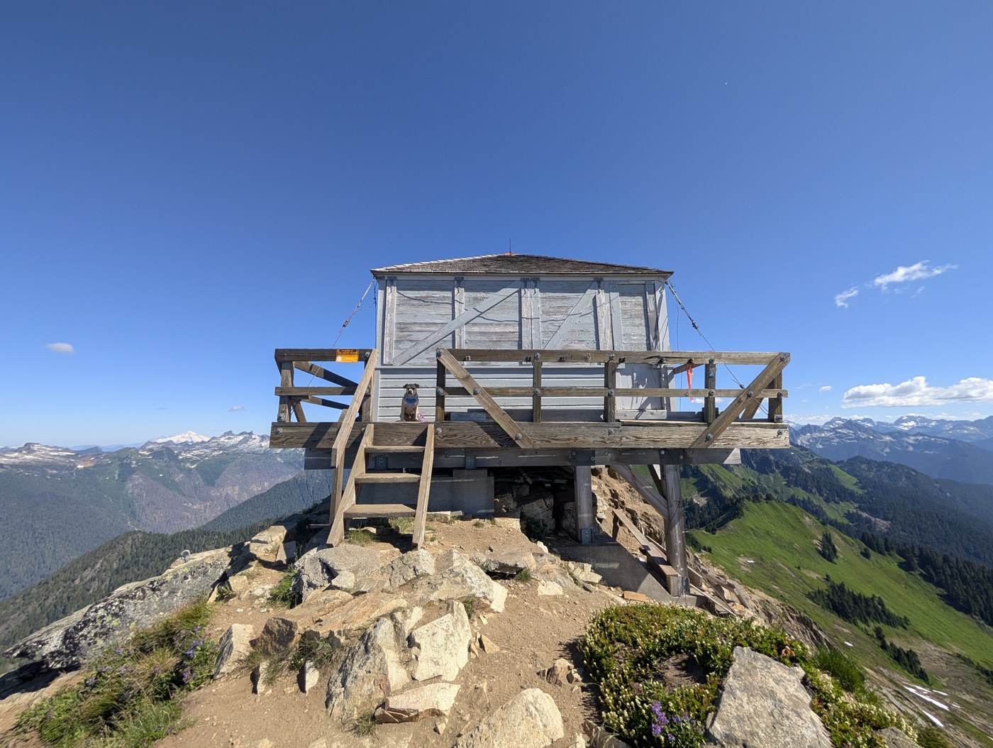 To beat the heat today, my friend & I started hiking at 6am, and we didn't see anyone else until we were half way down from the top. About 1.3 miles in, we emerged from the woods and into a very overgrown bushy section for a little under a mile. It's so overgrown that at times it was hard to see the ground and I accidentally slipped down once since I couldn't tell it was more slopey at that spot. But views started to open and we could see Glacier Peak better and better. Then it was a bit more of woods until we got to a small lake just a bit under the 3 mile mark. We can see the lookout from there, and it looked so discouragingly far away. But I was surprised to find that it's not bad at all the last mile up. Marmots were whistling at us as we got up (likely because they saw my dog). There was a really large one on a rock just below the lookout, and there were also two juvenile ones hanging out around the lookout. They were boxing each other and generally not afraid of us or my dog, who was staring at them.