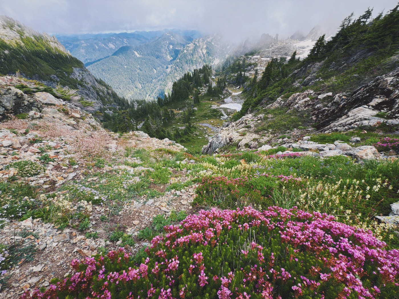Started up around 12:30PM timing for weather. This is a steep, overgrown trail through forest that turns into subalpine wonderland above treeline. Snow was not a problem, water available at 5370 feet, and bugs were manageable.