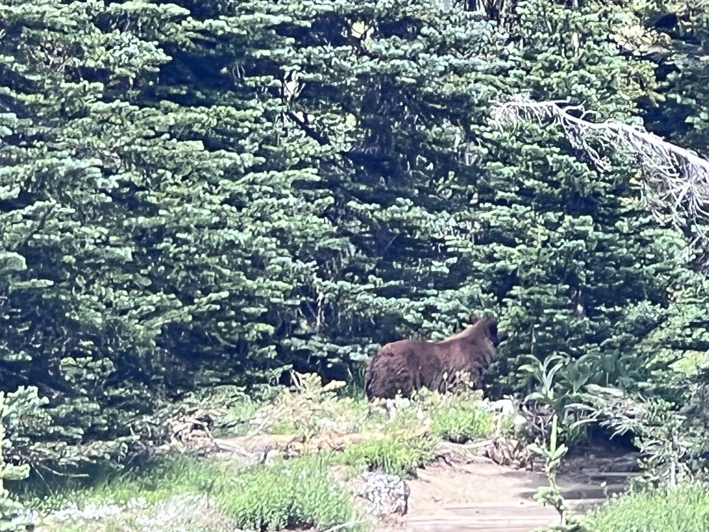 Had snacks at Summerland camp and spotted a bear also snacking near the group site that moved along down the hill pretty quickly without seeming very bothered. Marmots from afar.