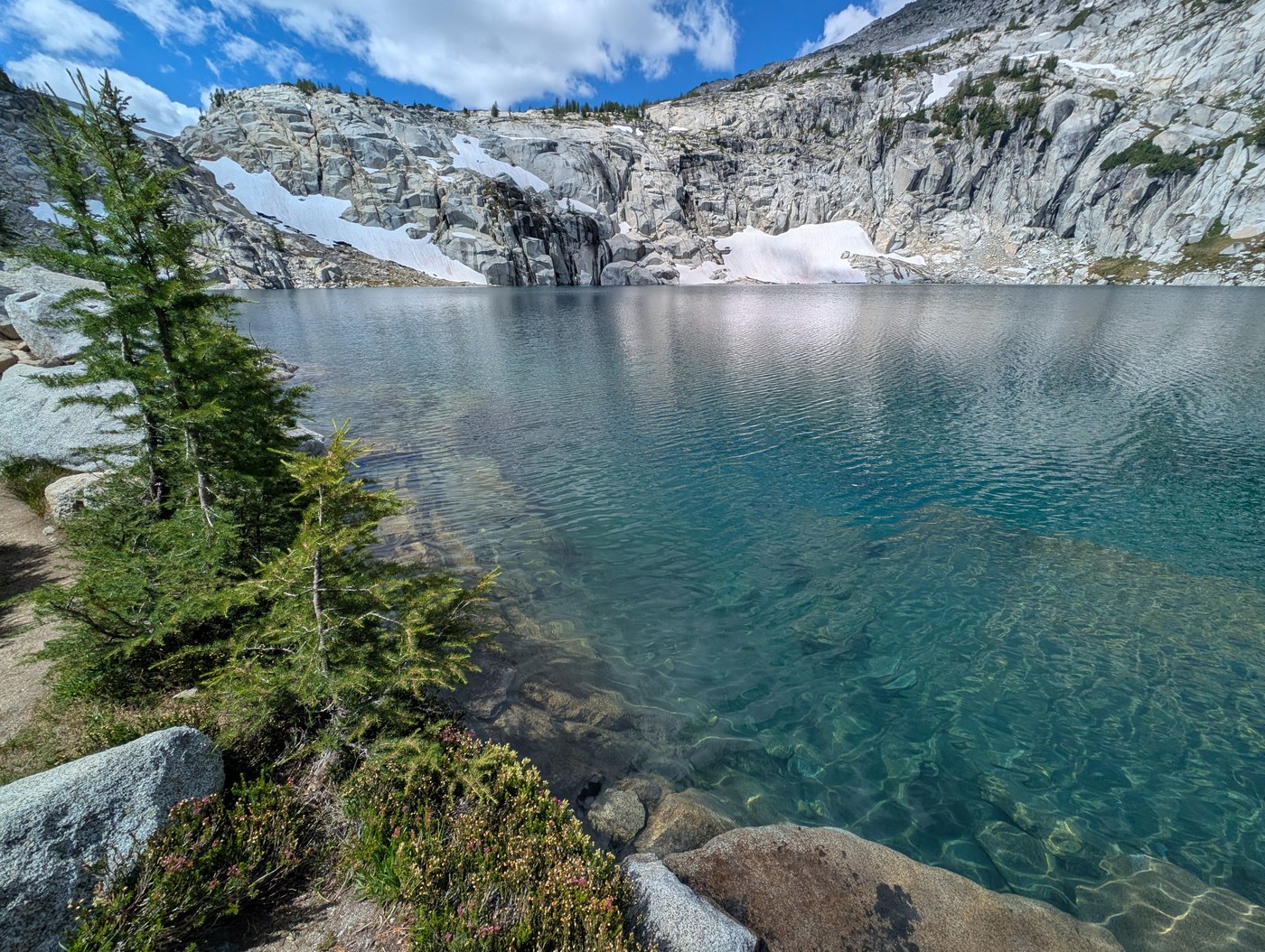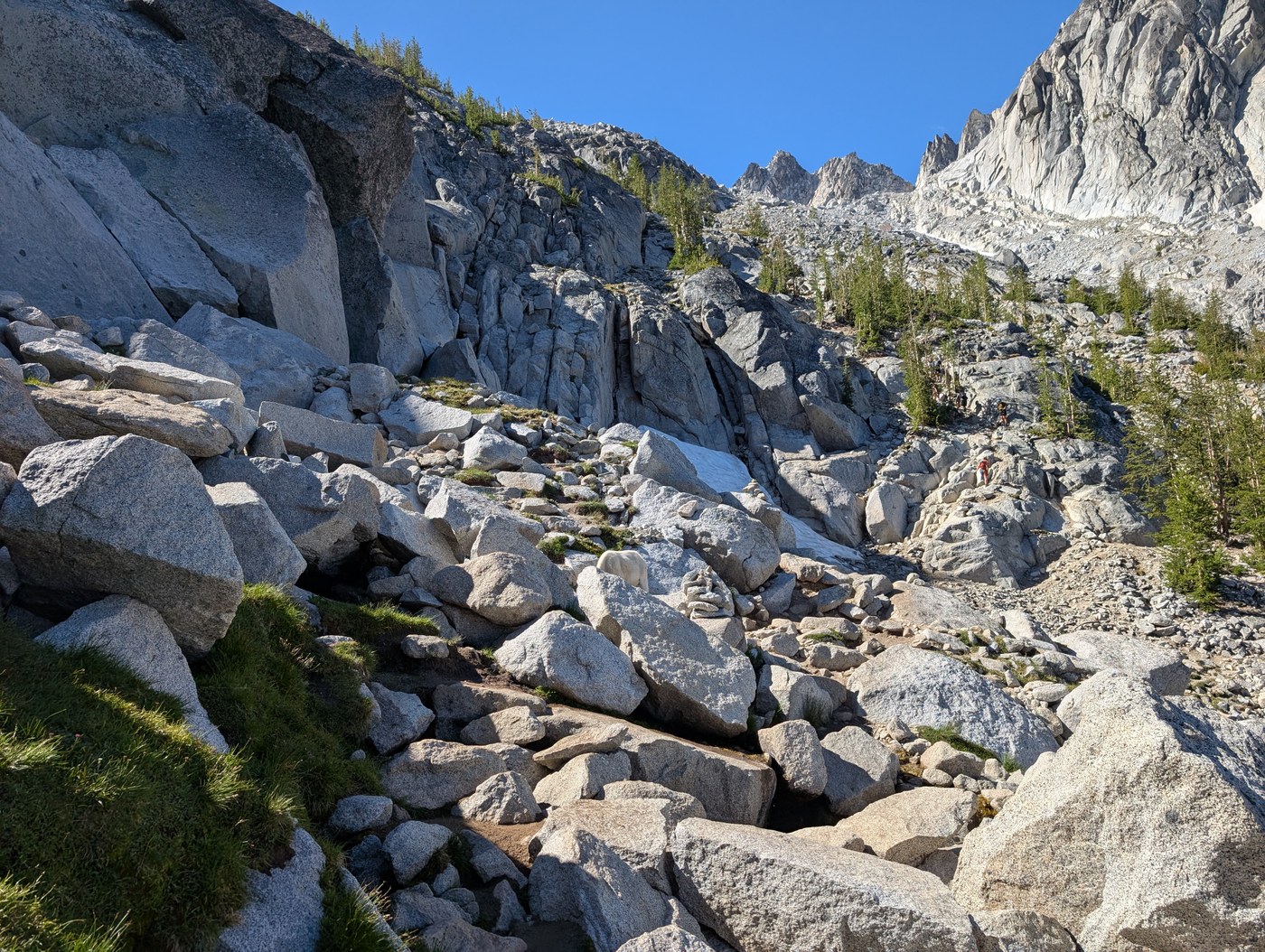 - Setting aside the actual elevation gain / loss, the trail is pretty easy going except for the parts that connect to the higher area. The trail at the end of Colchuck Lake starts with boulder hopping and then continues straight up to Aasgard Pass (no switchbacks), with cairns leading your way through the rocks. There are a couple places towards the top where you have to scramble a bit to get up, but not too bad. The other side from Lake Viviane down to Snow Lakes is very steep in places, and has some areas where you are just routing down or across granite slabs (happy it wasn't wet!). In these steeper areas I found myself spending more time figuring out the best way up/down, and looking for the next Cairn.
