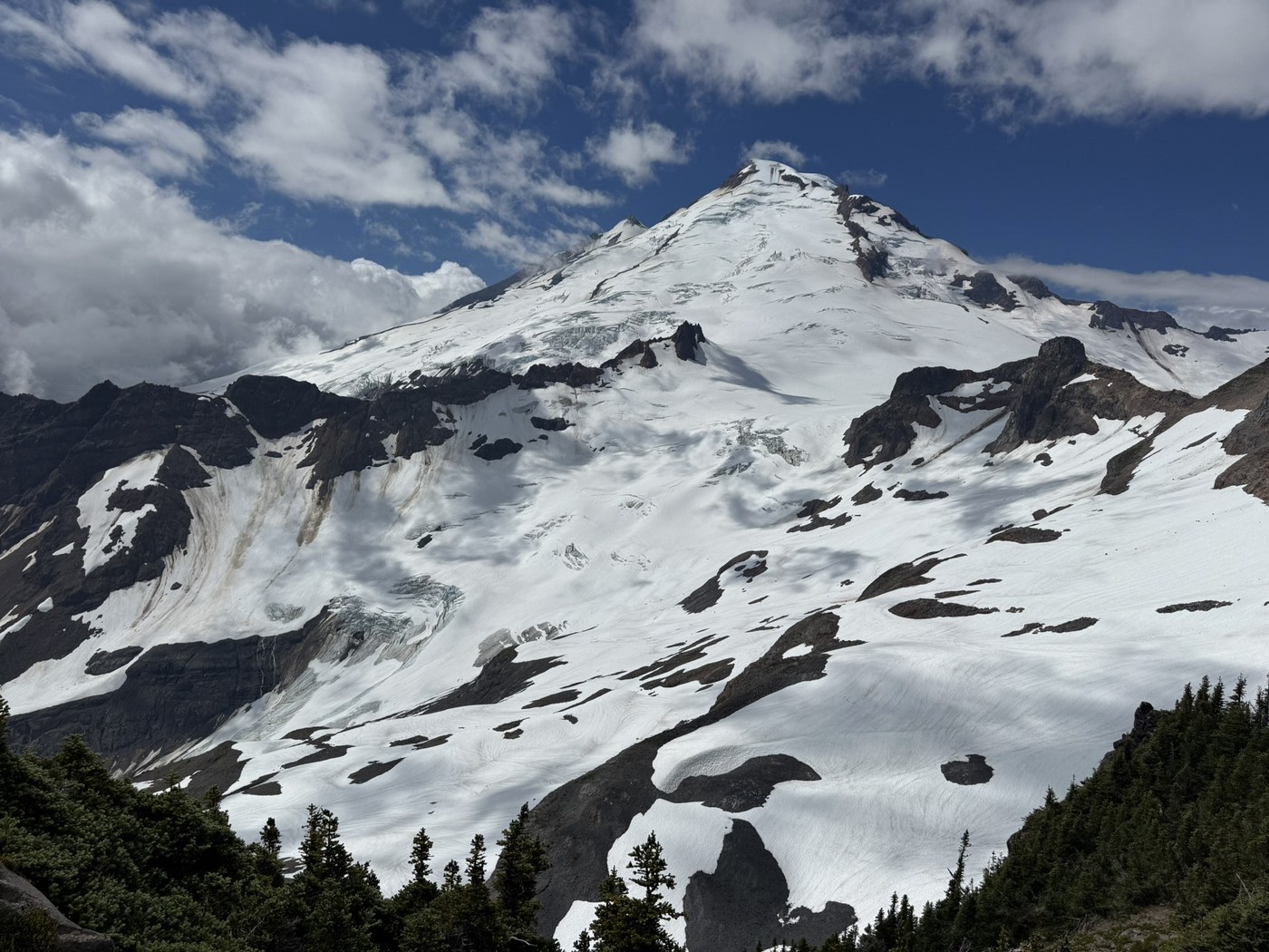 At 10am clouds started rolling in. Mr. Baker closed the curtains and retired from public life and Shuksan did the same half an hour later. The last section of the trail to East Portal is very difficult to find so your routefinding apps are necessary. East Portal is the most vertiginous place for lunch. I don’t usually have a fear of heights but looking west and down made me unable to balance for a while. It’s a spectacular place and the best bit was when the clouds rolled back for a moment to reveal Mt Baker and the crevasse-pitted Sholes Glacier.