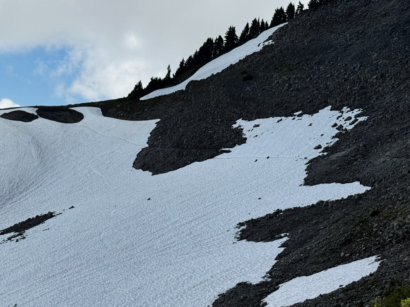 The first section is a spectacular traverse high on the slope of Table Mountain. No real difficulty and no snow (except for a little bit right near Artist Point). From the turn-off to Chain Lakes you have a significant downhill. Then, as you pass northwest of what All Trails informs me is Happy Bunny Butte, the snow starts. It was firm enough today but snow bridges are forming and postholing will become an issue. Difficult to know what to bring for the snow. I had crampons, which I put on and took off three times before stashing them back in my pack. The problem is that there are many stretches of snow to cross but they’re all short. Maybe just bring poles.