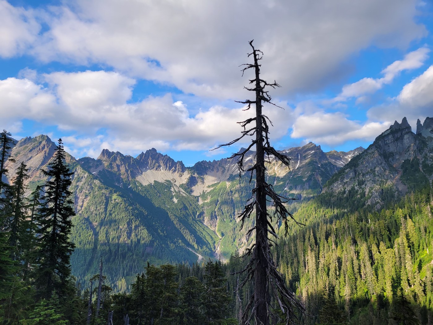 Once through Monte Cristo, we began the climb to the lake. The trail was forested and mostly shady. There were several blowdowns - we counted 5 in the "this is super annoying" category, which for me means they required bushwhacking, some sketchy maneuver, or taking off my backpack, but several other somewhat annoying ones too. The last .5 miles is especially steep up Poodle Dog Pass, and views of the nearby peaks are gorgeous.