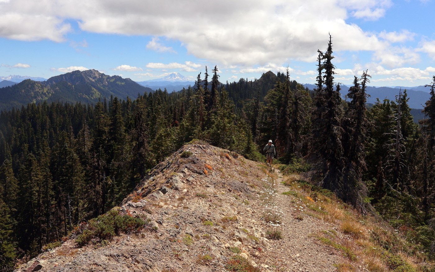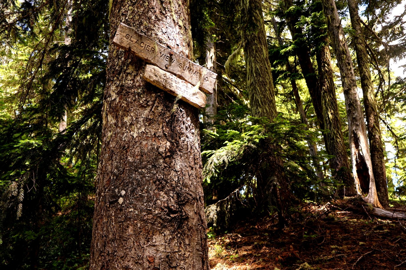 The trail is 2 miles to Glacier View. It's overgrown in places, debris covered in places, and great in places. But has about 30 or 40 fallen trees across it. We had a hand saw and had some incentive to cut smaller branches to get through once we realized we'd be coming down the same trail. And sure enough, on the way down we'd come up on some 3 tree monster pile and by finding our recent cuts we were able to find our trail through.