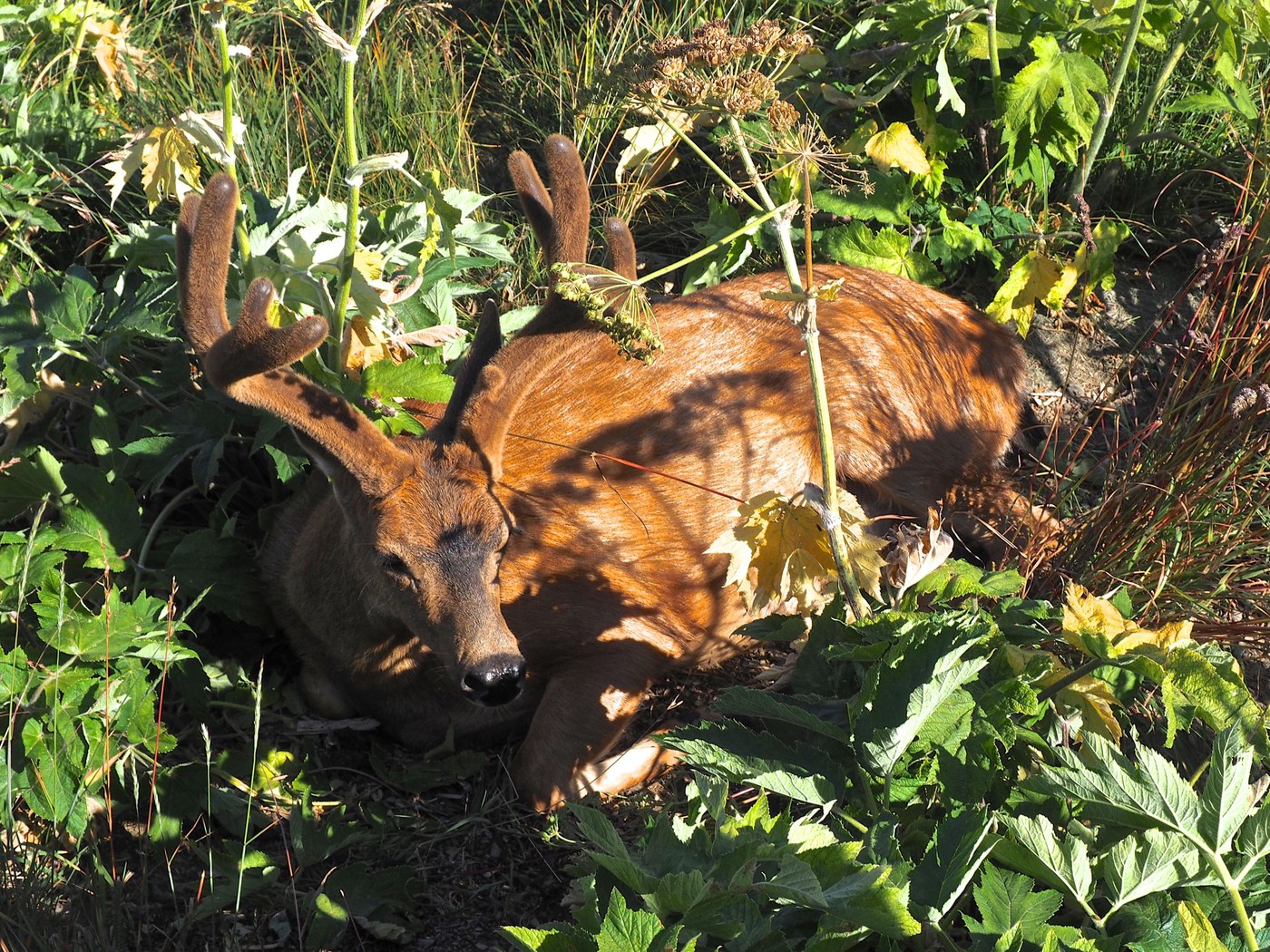 After getting a site at Heart of the Hills CG, we drove to Hurricane Ridge and walked a paved trail from the parking area. This was not a snowshoe as I am sure you know, but seemed to fit our short walk on paved trails from the parking area. We saw a buck and 2 doe close to the site of the former Visitor Center. A buck was bedded down less than 8 feet from the short wall and didn’t seem bothered by photos being taken! A nearby doe had dug a hole in the shade and was comfortably lying in it and not disturbed by the attention it was getting! Another doe soon joined them. Flowers were past their prime! Harebells were the most prevalent flowers along the trail. One blooming lupine was seen. Many flowers were seen on our drive to Hurricane Ridge and our return to the CG.