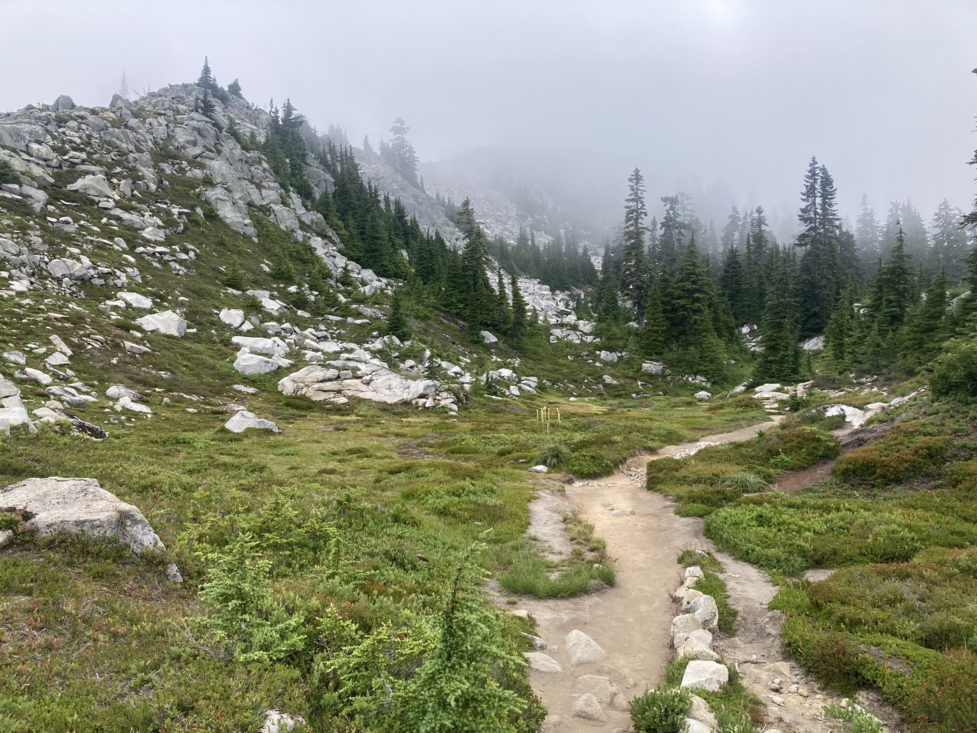 Beautiful cloudy day for a day hike. This hike was prettier than expected. Started early at 7am. Pretty quiet on the trail. Saw lots of folks on our way back down. Plenty of wildflowers and ripe huckleberries.
