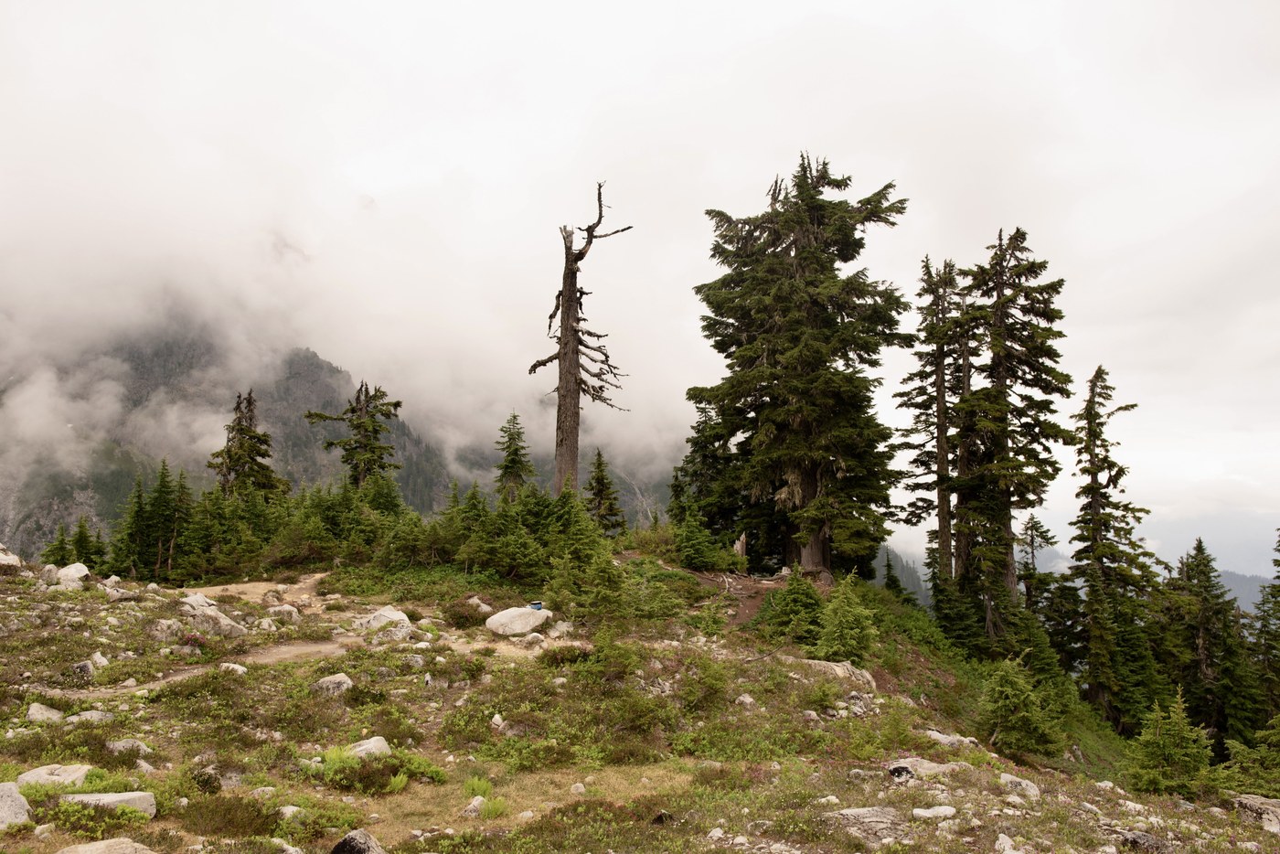 Trail is in good condition all the way. There was water available intermittently once you descend into the swift creek drainage. Lots of wildflowers, and huckleberries are starting to ripen though weren’t yet abundant. Unfortunately Shuksan was mostly obscured by clouds, still beautiful.
