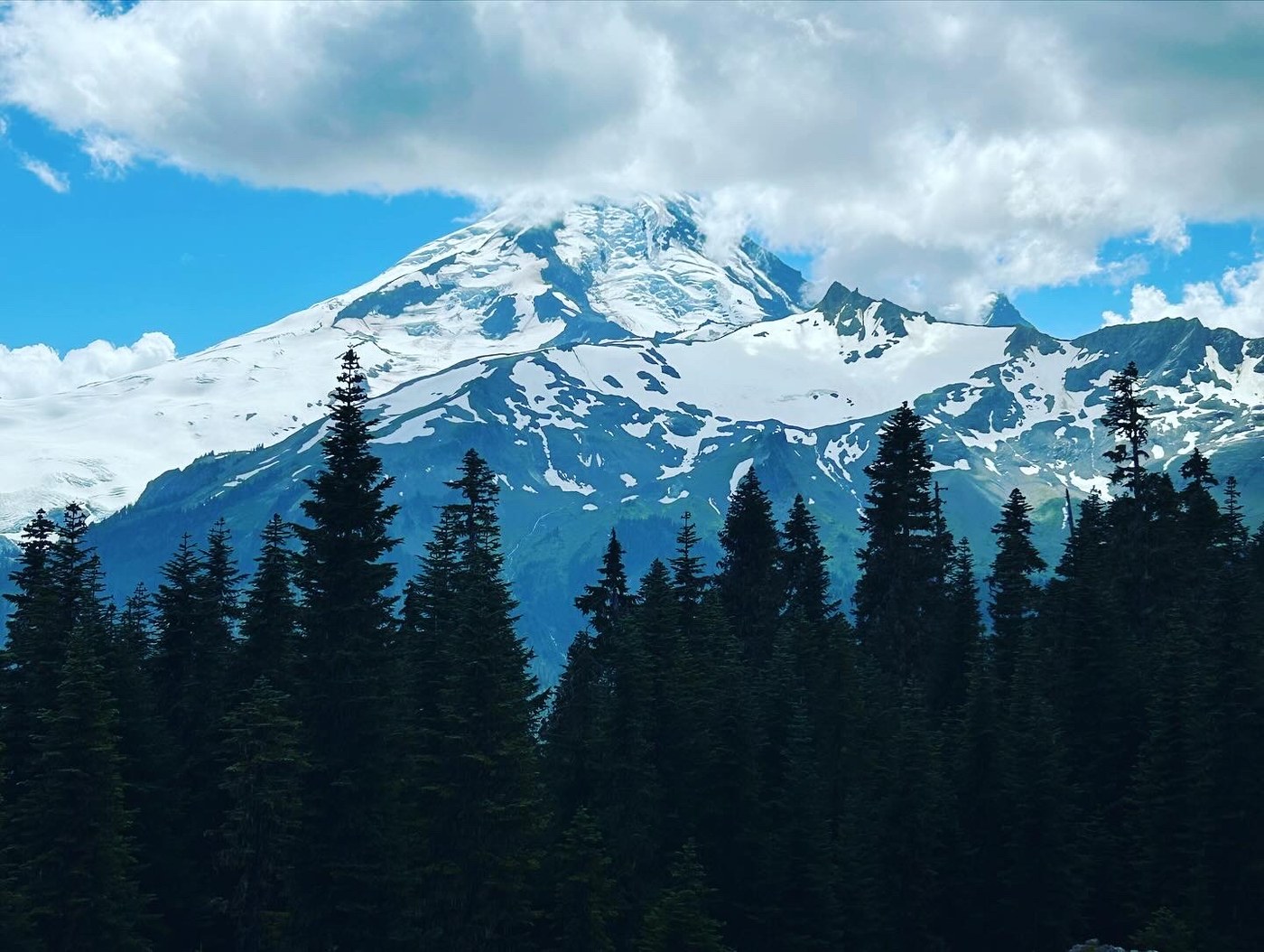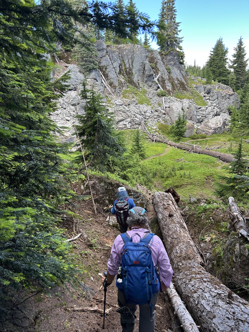 The trail starts out through lovely subalpine forest at an easy elevation gain. There were one or two downed trees that were easy to get over in the first stretch. At 0.8 miles we came out on amazing views of the mother Komo Kulshan(Baker) and Mt Shuksan, up close. Also very interesting geology. If you aren’t in good shape or have young kids this might be a turn around point. From that overlook the trail drops very steeply over the edge of the rocky point, 40 feet or more so down a rough and very loose trail. Happy for poles that I don’t normally need.At the bottom be sure to observe the geology again. From there for the next mile to about 1.8 miles, the trail is in old growth forest with no mountain view, and goes steeply down then back up several of what I am calling gullies, with multiple large down trees to go over and around. It was a challenge for a couple in our group that weren’t as nimble as they would have liked. At 1.8 miles we came out on a gorgeous wildflower meadow and the views of our mountain friends opened back up and made the hike worthwhile. It appeared the trail would go back into the trees. Since we had already been delayed giving aid to a backpacker suffering from dehydration, overheating and panic, due to what sounded like a GI bug the day before(2 in our group were medical professionals) we turned back at this point.