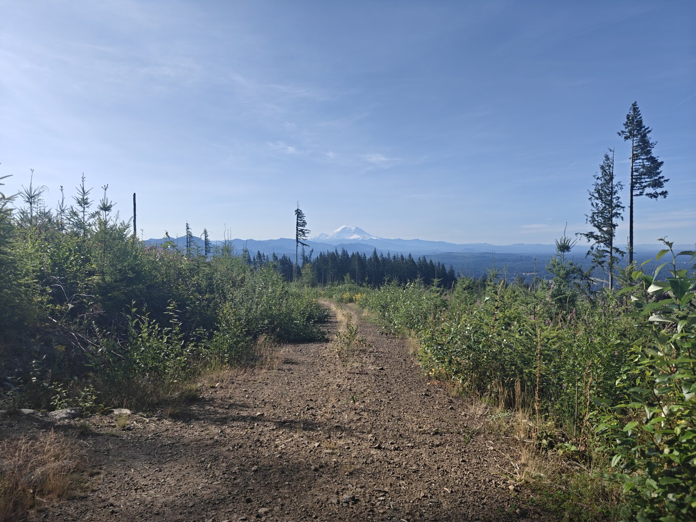 After turning from S Tiger Traverse onto S Tiger Summit, the trail gets more narrow & overgrown with grasses, blackberry vines, and foxglove. The foxglove in particular is all dried out now, and when you run into it (which is inevitable) it spreads seeds all over you. I took quite a lot of foxglove seeds & lots of blackberry vine scratches home with me. There are also a few holes in the trail near the summit, so watch your step. On the plus side, from most of this section of the trail you have expansive views South & West, with a great vantage point on Rainier.