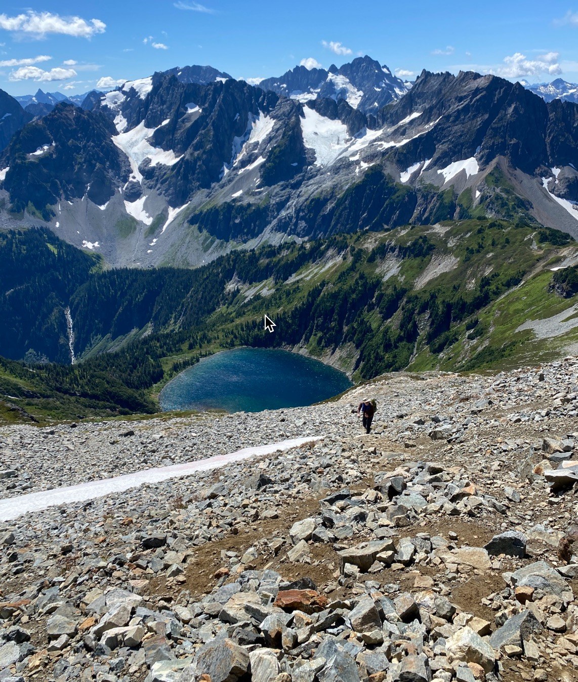 I'd really recommend that once you get to the top and catch your breath, that you continue along hikers' right. There were perhaps 20 people at the top but nobody just a few minutes walk farther. Several more hidden camp spots and pools where water is melting out of the glacier and snowfields. We even found a vein of fool's gold and something that really looked like silver. And tough, interesting plants hidden in the cracks of the rock. Also note the scratches in the bedrock from the glacier.