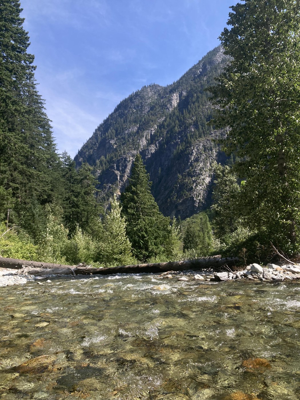 Next day it was drizzling and cloudy. Headed for High Bridge camp. The trail looks like it's right by the Stehekin river on the map but you are above it most of the time making it inaccessible for water except for a few places (Flat Creek Trail junction was a good fill up spot). Most of the trail between Cottonwood and Bridge Creek was VERY overgrown. It was a bit disconcerting as there was A LOT of bear scat, and we felt we couldn't see if there was a bear up ahead. Luckily we didn't see one. The trail improved as we got closer to bridge creek and opened up/was maintained on the PCT section to Bridge Creek Camp. Saw very few people again and had our pick of sites. We were elated to see picnic benches at the site and easily accesible water from a creek. Both sites have bear boxes. We did a day hike to HIgh Bridge, then took the bus to Stehekin (CHECK THE SCHEDULE ahead of time, we did not and missed the 12:45 bus by 10 minutes...waited for 2.5 hours for the next one) and enjoyed a 90 minute visit to beautiful Lake Chelan and Stehekin. A dip in the cold water was appreciated on this hot, sunny day.