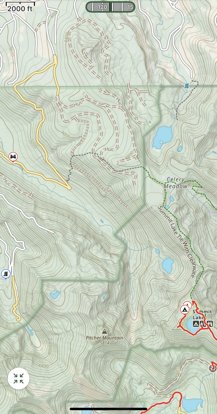 In your second photo that shows the bridge, and then a short while later the hairpin turn where the *rough* trail starts....I know that corner, Didn't know there was a trail there. I've driven all the way to the end of the yellow marked road in that photo. And also explored each of the rougher legs of it that fork off from there. If you take the right path you can get on a ridge that overlooks Cedar lake. At the end of it is a pretty well defined trail(as of 10 years ago) that connects into celery meadows. The last bit of road was very rough. I made it most of the way in a pickup once (couldn't make it the last 200 yds without 4wd). Rode dual sport motorcycles up there a couple times. That was the smoothest and fastest way to get up there.