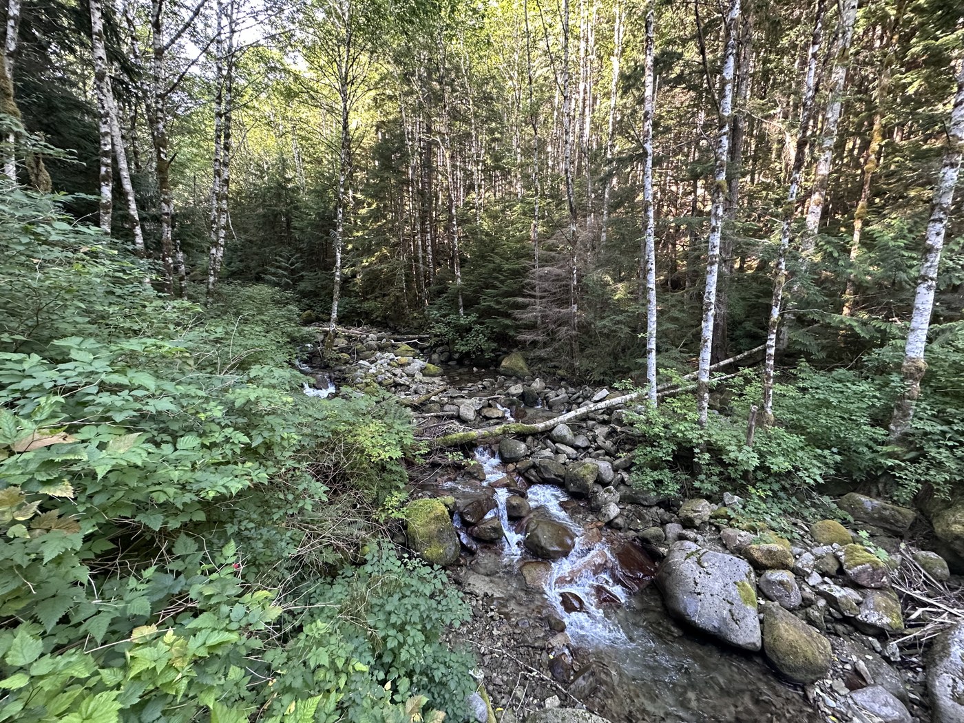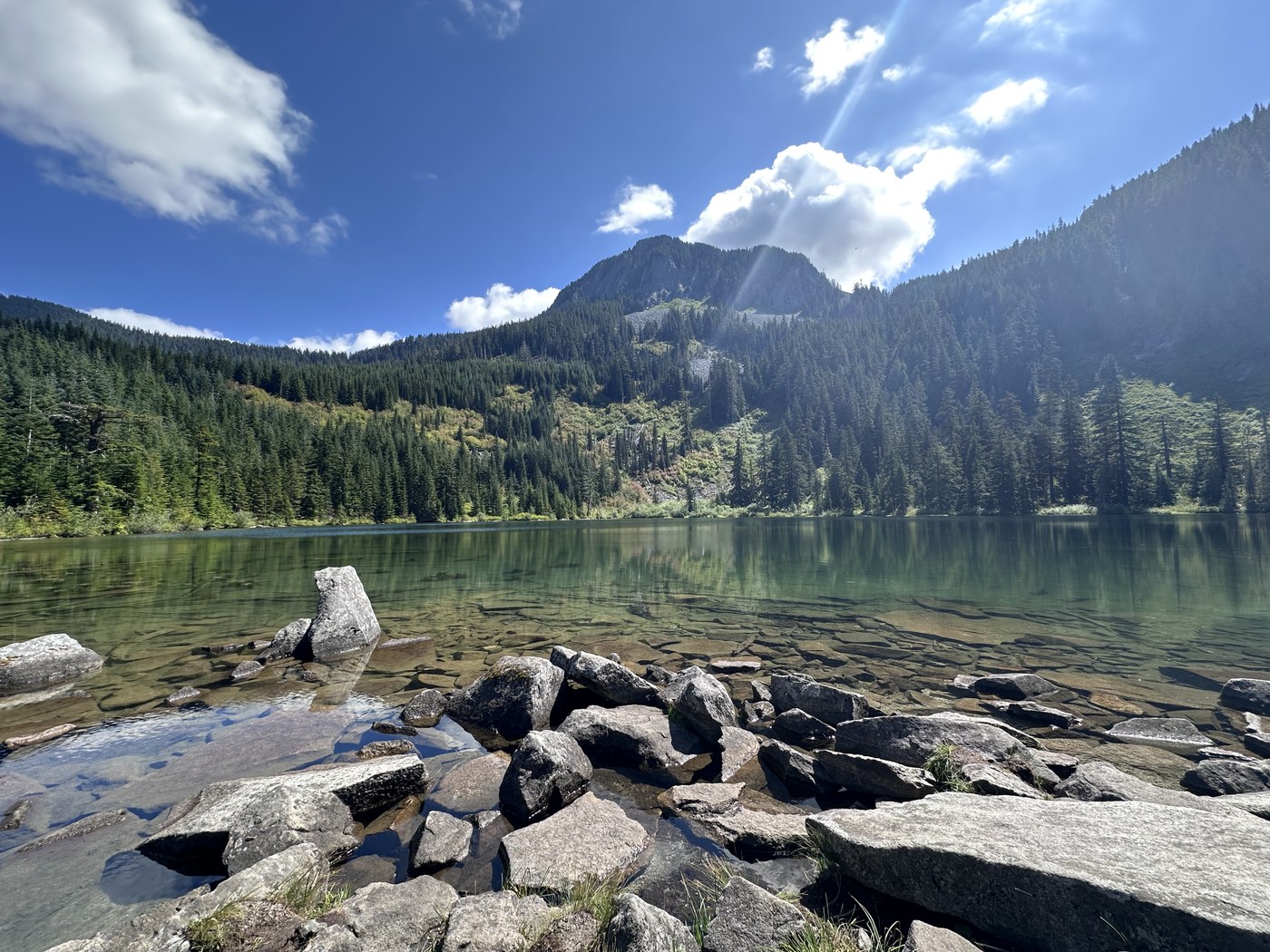 I hit this gorgeous hike the day after the August 2025 heat wave, starting at 9am, reaching the lake (lakes? I suppose) at 11:40 going at a slow pace because I was distracted by all the thimbleberries, eating them the entire way to and back. In further delights to the senses, this hike then treated me to a tranquil swim in the lake (thanks heat wave!) and refreshingly strong breezes on the way down, which felt longer than the way up somehow, even though I was picking berries the whole time both ways (hehe).