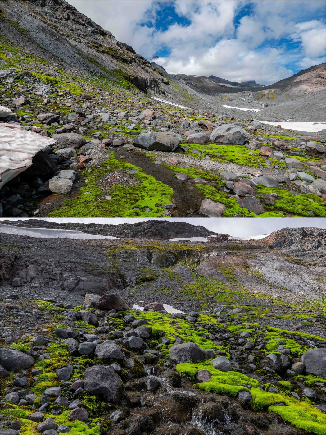 This is a great WINTER snowshoe (see link) but I had never done in late summer. WHOA! Amazingly beautiful, and lots to explore before and beyond the "end of maintained trail", of course staying on rock at all times to avoid tundra damage (CAUTION: Rockfall hazard, snow bridges, rushing COLD glacial water surrounded by crumbling slopes). This is the perfect hike when the upper mountain is shrouded in cloud as it was today, since once in the dead-end valley, you are in your own little world with Paradise and Steven's glaciers looming overhead, and countless waterfalls cascading down the surrounding headwalls. The flowing water adds splashes of color - green, yellow and oranges mosses with hardy alpine flowers (e.g. monkey flower) - to the otherwise moonlike landscape. There are some significant snowfields, many with water flowing underneath and visible bridges and ice caves, but you can ascend the slopes, watching for rockfall, to avoid them (at least as far as I went). I look forward to returning and trying to attain the end of the valley.