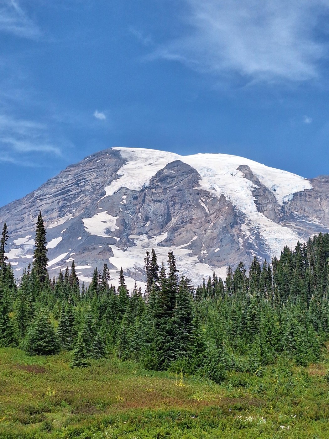 We hiked to Glacier Vista and most of the way up to Panorama Point. It was hot and steep, but the mountain was out in full glory and the air smelled wonderful. There are still wildflowers, but they are fading away. There were a lot of people on the lower trails, but it thinned out as we went higher. We saw a few grouse along the trail, and lots of chubby little chipmunks hoping for a handout.