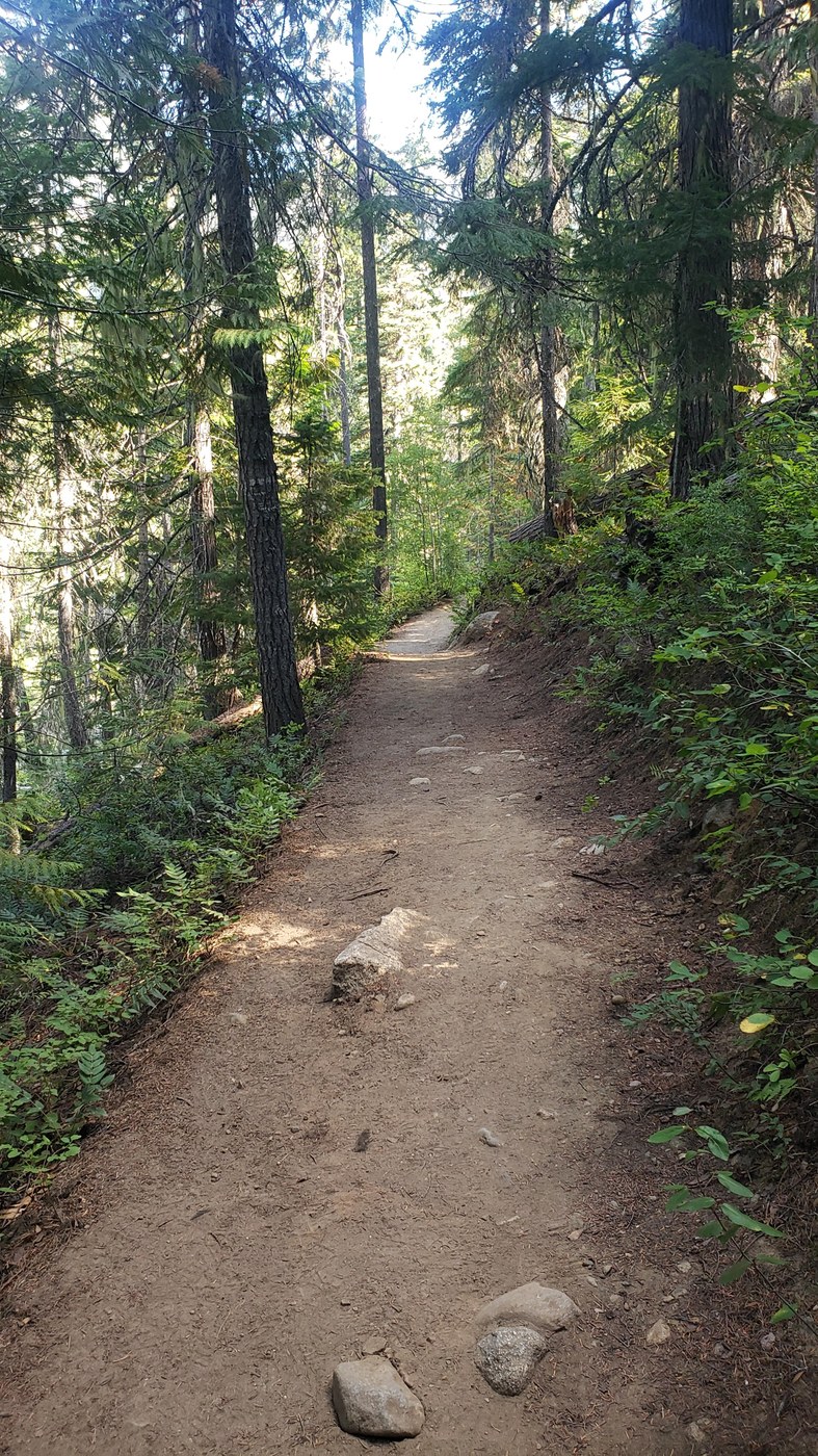 This was a fabulous hike - 4.2 mi, nearly level, along Icicle Creek with lots of flowing water still in late August - and the trail was in the shade all the way on both sies of the river. You can start anywhere - its a loop. From the trailhead for the Icicle Gorge Nature Loop you can go either way since the trail crosses the river and back with two big bridges. We started on the trail about 10:30a on a day that the Leavenworth temperature was forecast to be mid 90's. But up on the trail the temp in the morning was in the 70s all morning. The trail has lots of access points to enjoy stopping for rest, viewing, lunch, etc, on both sides of the creek. The trail was nearly flat and very well maintained. It is a Nature trail with several signs discussing the plants and environment. On this day, the start of Labor Day weekend 2025, we encountered some, but not a lot of people and there was no problem parking at the trailhead. You can see the creek nearly continuously for much of the trail. We did not notice any mosquitoes or other bugs. It was just a lovely morning.