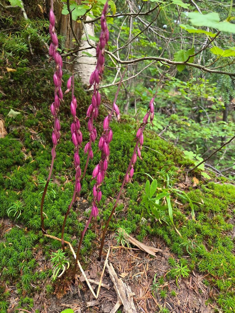 First, getting there. Both 25 & 26 have bridge reconstruction, but detour works. From Randle 131, left at Y-junction to 23, then right on 28, then right on 76 (pass Cispus Learning Center) 7 miles, then left on to 25, then right on 99 to Bear Meadows Viewpoint (plenty of parking and restroom). Trail starts across the road as Boundary #1 for 1/2 mile, then become Strawberry #220 (sign on tree) to lookout site. Four large deadfalls to negotiate on #220. Spectacular views. Nice little hike with great views. Blueberries are ripe, so fresh bear scat. Some native red orchids along the trail. We then drove on 99 to multiple viewpoints and turned at Windy Ridge. Stairs there go to the top of Windy Ridge, a nice little addition. WTA trail description is accurate.