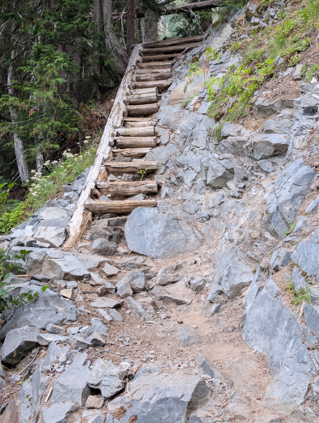 I continued on to cross Van Trump creek on a log bridge, with Upper Comet Falls visible upstream and went up to Mildred Point. The trail up from the junction is quite steep and there is a sandy section as well to add to the adventure. No switchbacks on this part of the trail.