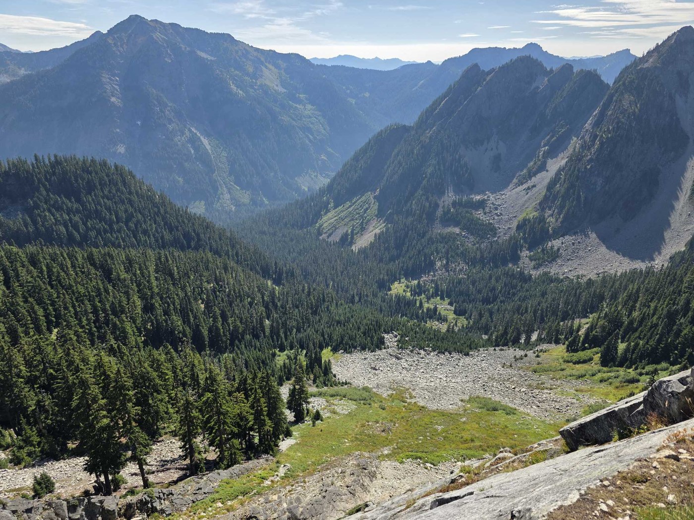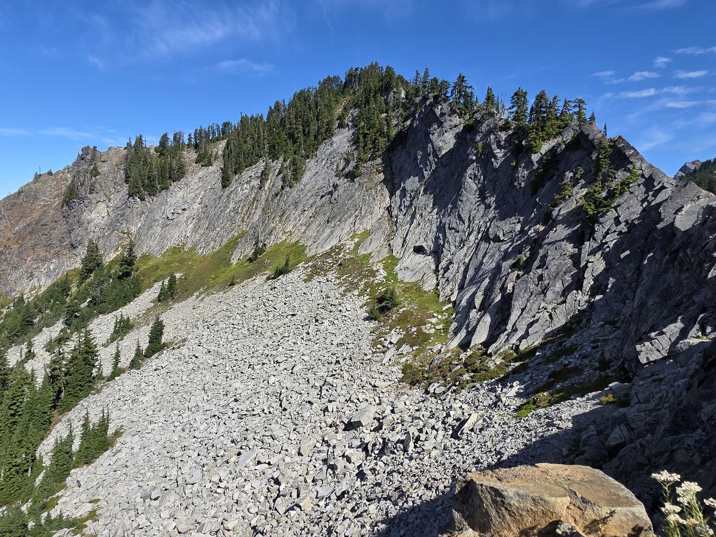 Elevation gain is steady throughout but never steep. The last ~400ft of vertical gain up to the pass was, deceptively, a butt kicker on tired legs. It is all open talus and would be hot in the peak of the day. I was glad for my early start which afforded me shade during this stretch.