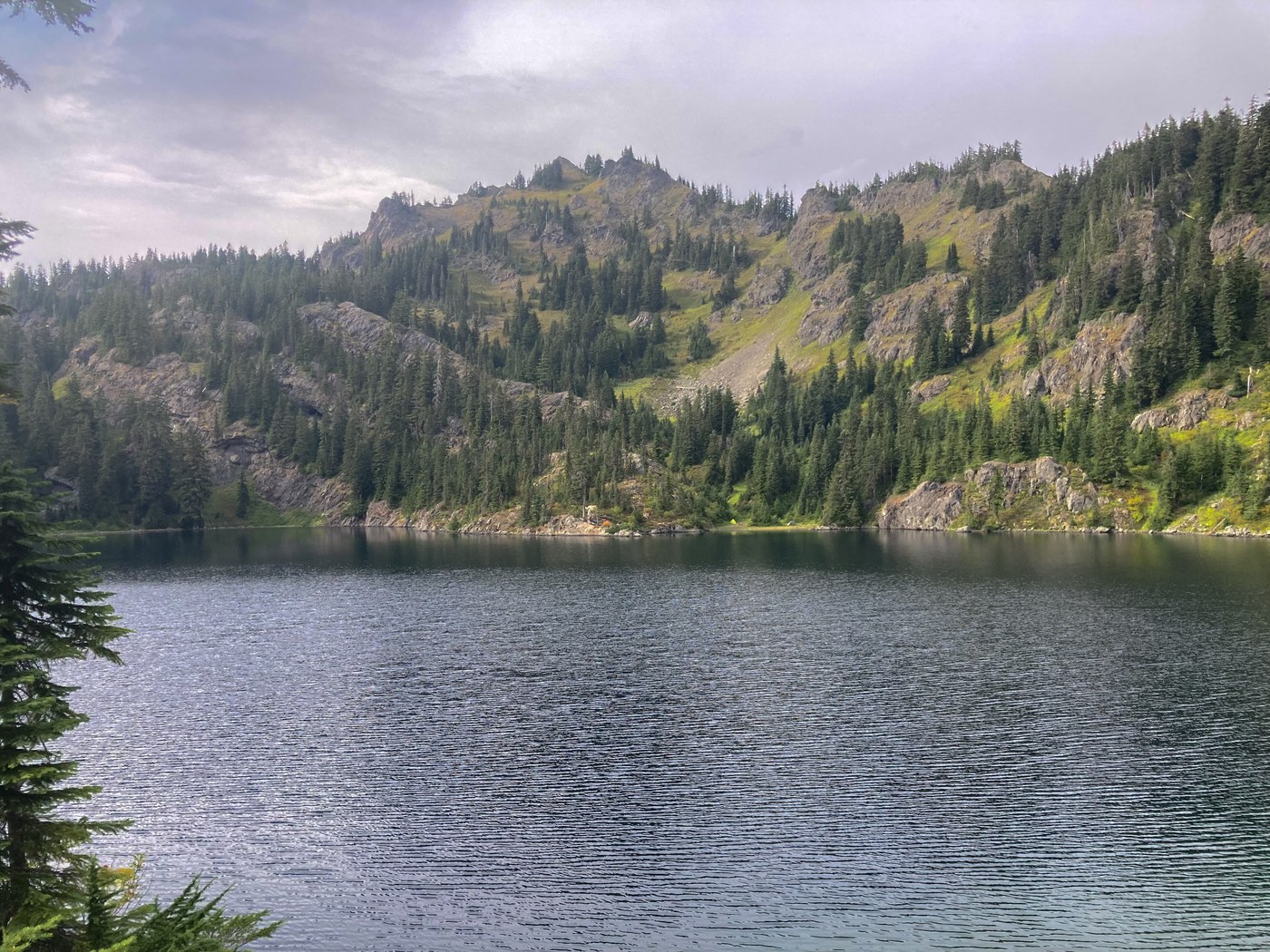 After 0.75 miles, we took the short side trail to pretty Lake Laura, surrounded by mountains and showcasing a rocky peninsula. On the ridge there were some filtered views, including of Rainier! Then we continued up the steep path to Lake Lillian. This lake was also beautiful, and we met many backpackers staying the night and some fishers and swimmers. Two trails go along the shore, one to the left and one to the right. Both involve some light rock scrambling and are slightly exposed - use caution. We spent some time exploring and relaxing by the water before heading back down.